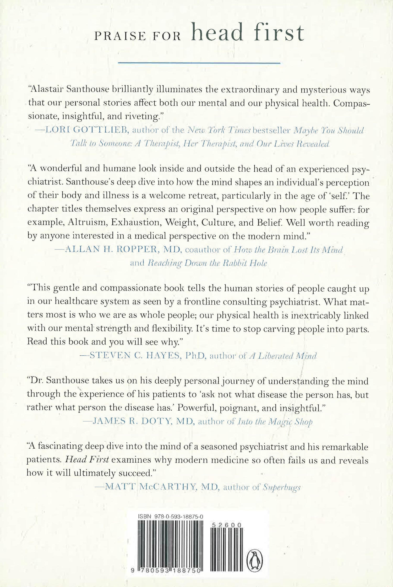 Head First chronicles Santhouse's many years treating patients and his exploration of the ways in which our minds exert a huge and underappreciated influence over our health. They shape our responses to symptoms that we develop, dictate the treatments we receive, and influence whether they work. They even influence whether we develop symptoms at all.