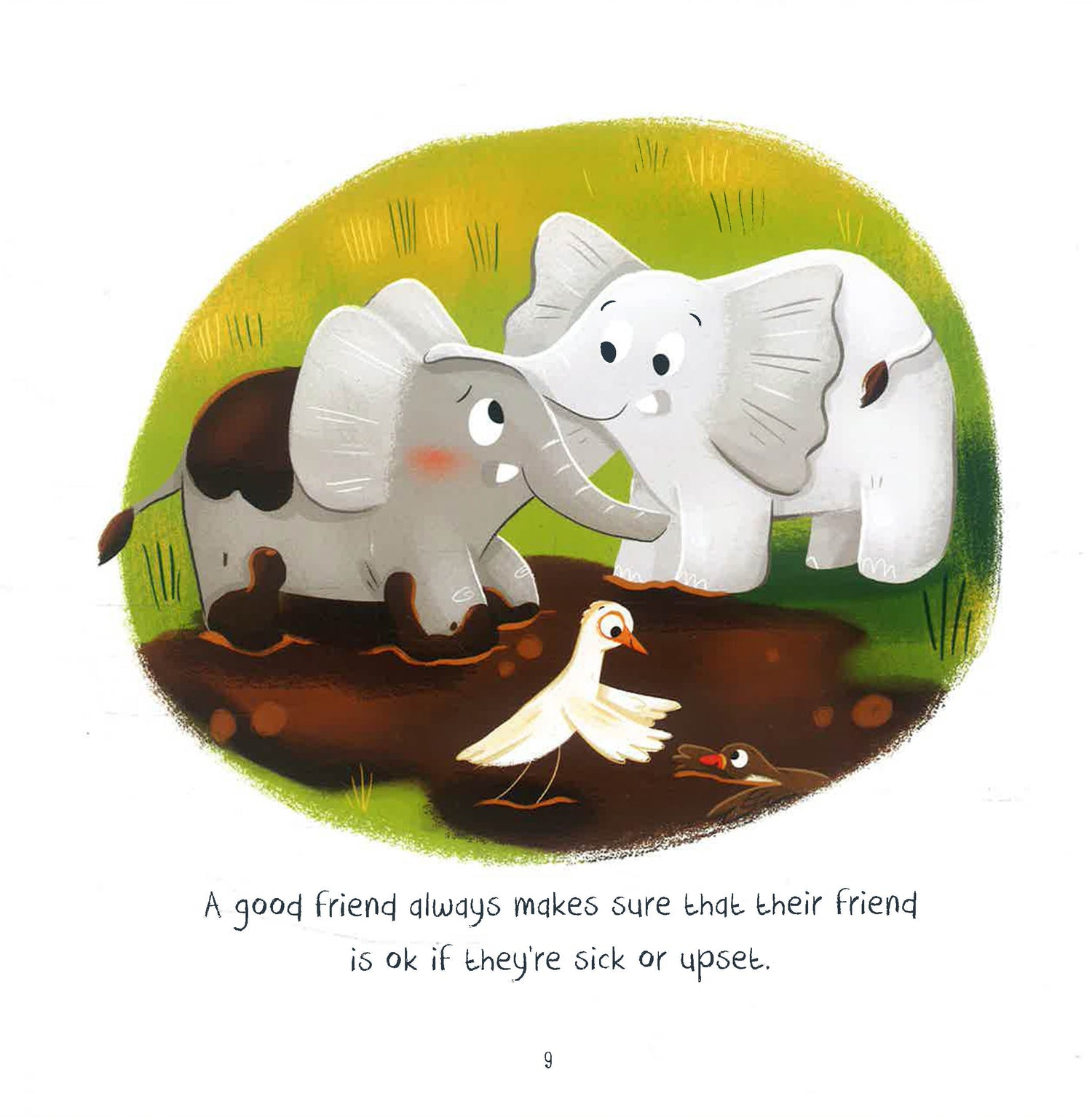 Elephant loves seeing his friends and making new friends and he has lots of tips for how to be a good friend. The book covers topics such as empathy, saying sorry and listening.