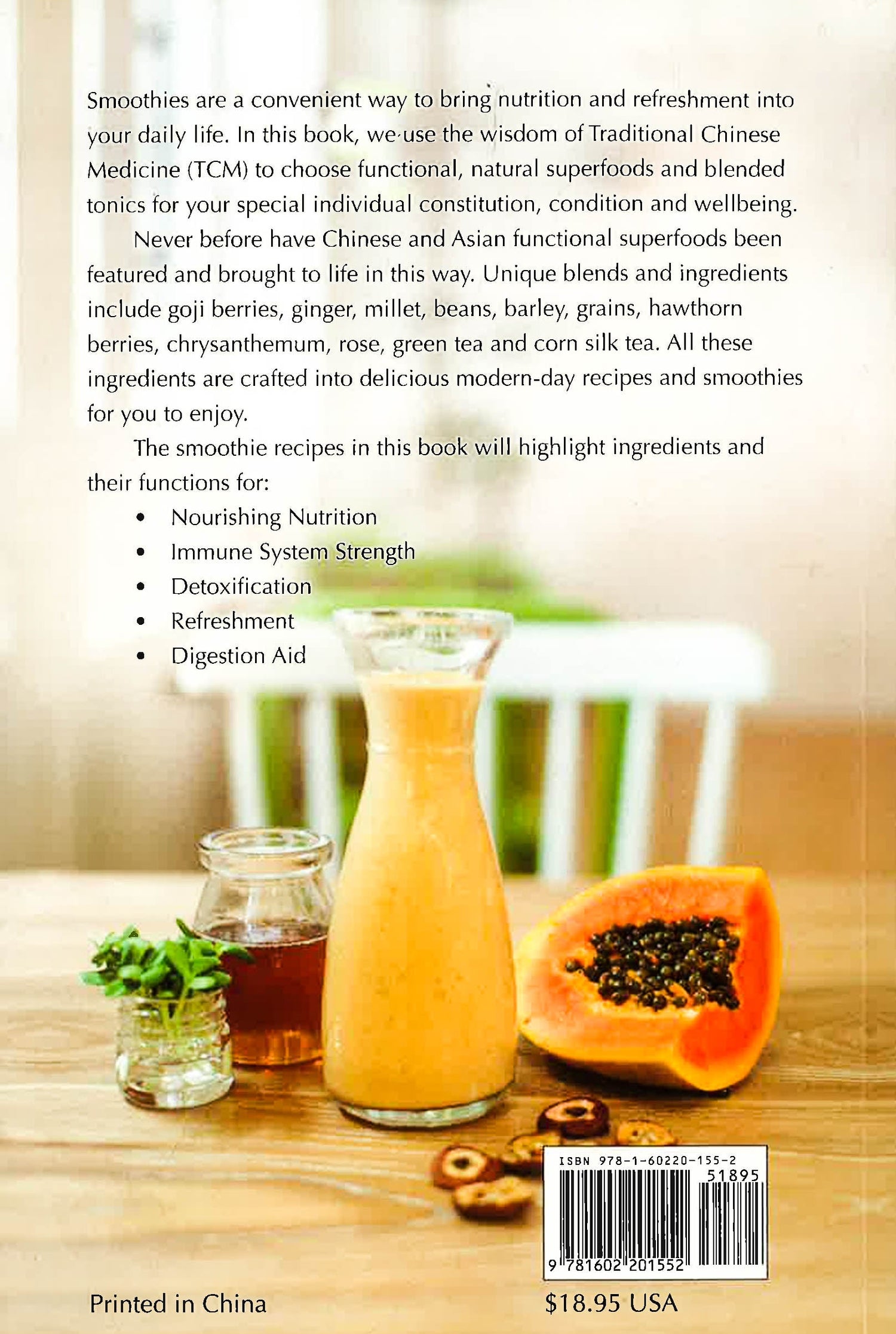 Never before have Chinese & Asian super foods been featured and brought to life in this way. Unique blends and ingredients include goji berries, ginger, millet, beans, barley, grains, hawthorn berry, chrysanthemum, rose, green tea, and corn silk tea. All the ingredients have been crafted into over 30 modern-day delicious recipes and smoothies for you to enjoy.