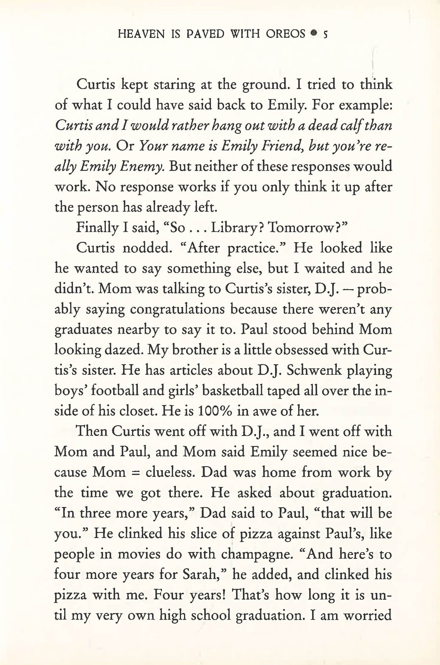Fourteen-year-old Sarah keeps a journal of her pilgrimage to Rome with her eccentric grandmother, Z, her evolving relationship with best friend Curtis, and daily conversations with Curtis's sister and star athlete, D.J.
