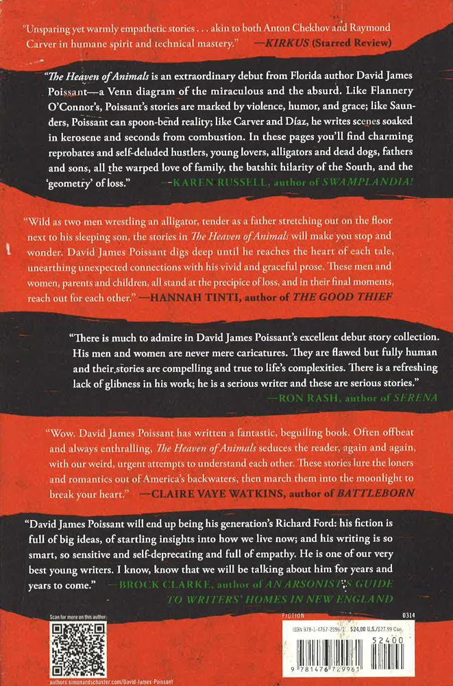 In each of the stories in this remarkable debut, award-winning writer David James Poissant explores the tenuous bonds of family - fathers and sons, husbands and wives - as they are tested by the sometimes brutal power of love. His strikingly true-to-life characters have reached a precipice, chased there by troubles of their own making. Standing at the brink, each must make a choice: Leap, or look away. Pulitzer Prize finalist Lee Martin writes that Poissant forces us "to face the people we are when we're alone in the dark." From two friends racing to save the life of an alligator in "Lizard Man" to a girl helping her boy-friend face his greatest fears in "The End of Aaron," from a man who stalks death on an Atlanta street corner to a brother's surprise at the surreal, improbable beauty of a late night encounter with a wolf, Poissant creates worlds that shine with honesty and dark complexity, but also with a profound compassion. These are stories hell-bent on hope. Fresh, smart, lively, and wickedly funny, The Heaven of Animals is startlingly original and compulsively readable.