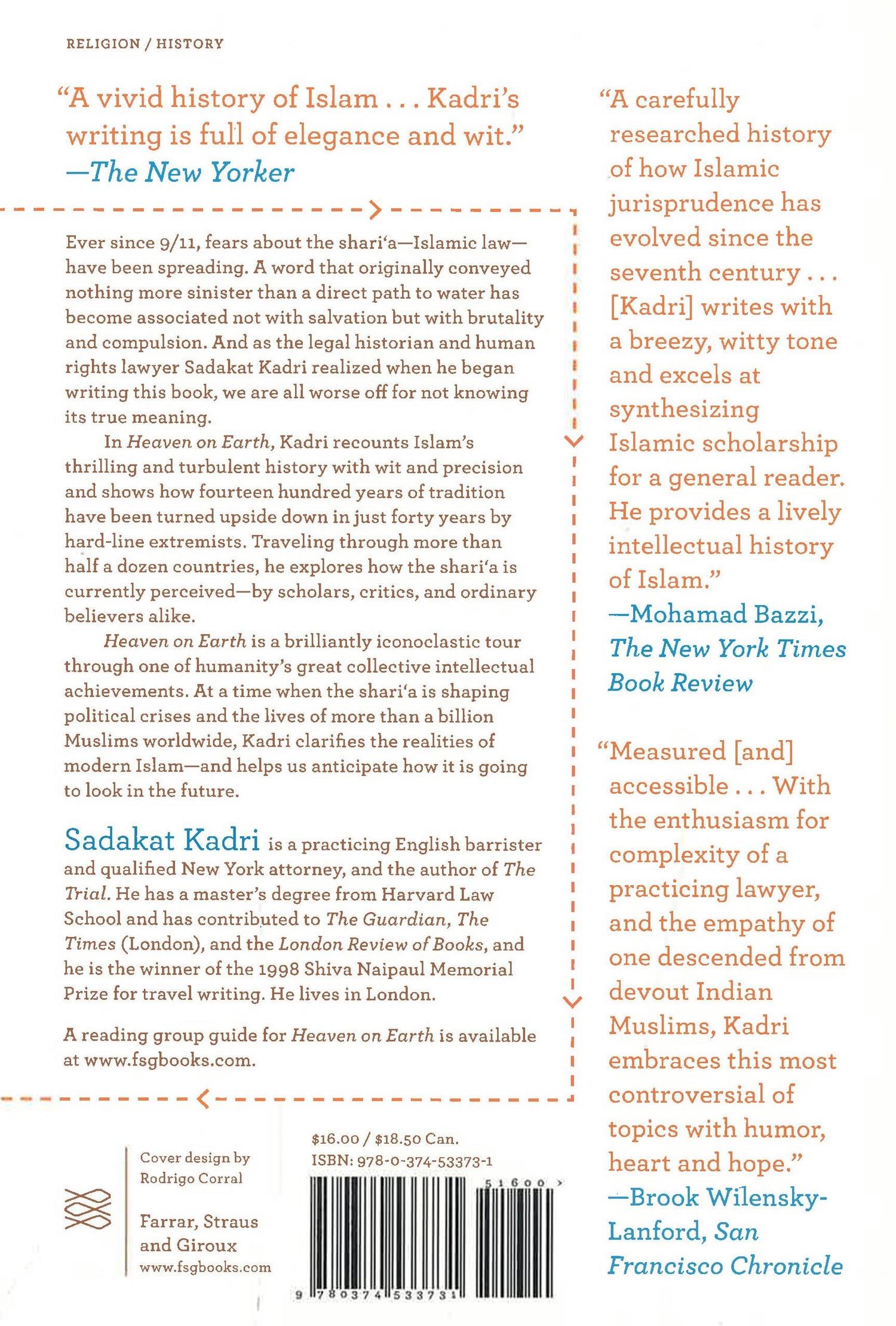 Ever since 9/11, fears about the shari'a--Islamic law--have been spreading. A word that originally conveyed nothing more sinister than a direct path to water has become associated not with salvation but with brutality and compulsion. And as the legal historian and human rights lawyer Sadakat Kadri realized when he began writing this book, we are all worse off for not knowing its true meaning. In Heaven on Earth, Kadri recounts Islam's thrilling and turbulent history with wit and precision and shows how fourteen hundred years of tradition have been turned upside down in just forty years by hard-line extremists. Traveling through more than half a dozen countries, he explores how the shari'a is currently perceived--by scholars, critics, and ordinary believers alike. Heaven on Earth is a brilliantly iconoclastic tour through one of humanity's great collective intellectual achievements. At a time when the shari'a is shaping political crises and the lives of more than a billion Muslims worldwide, Kadri clarifies the realities of modern Islam--and helps us anticipate how it is going to look in the future.