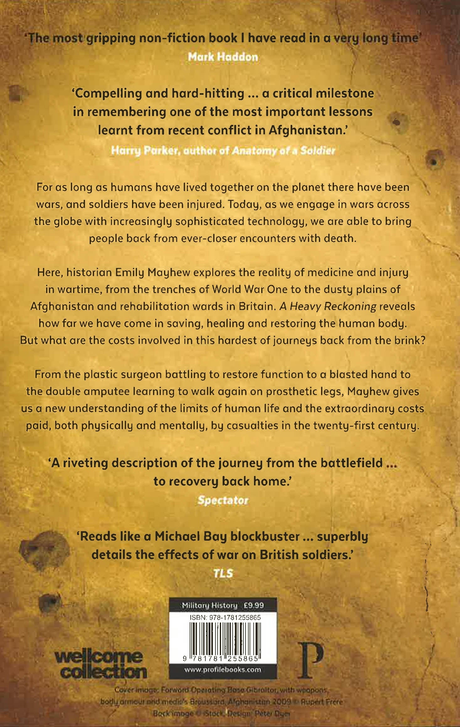 Historian Emily Mayhew explores the reality of medicine and injury in wartime, from the trenches of World War One to the plains of Afghanistan and the rehabilitation wards of Headley Court in Surrey. Mixing vivid and compelling stories of unexpected survival with astonishing insights from the front line of medicine, A Heavy Reckoning is a book about how far we have come in saving, healing and restoring the human body.