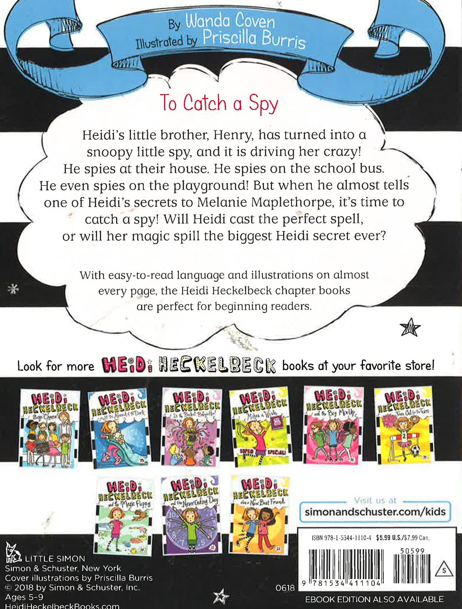 In the twenty-third Heidi Heckelbeck adventure, Heidi discovers a snoopy spy in her house!Heidi's little brother, Henry, has turned into a snoopy, little spy and it is driving her crazy! He spies when her friends are over at their house. He spies on the school bus. He even spies on the playground! But when he almost tells one of Heidi's secrets to Melanie Maplethorpe, it's time to catch a spy! Will Heidi cast the perfect spell to stop her bothersome brother, or will her magic spill the biggest, Heidi secret ever? With easy-to-read language and illustrations on almost every page, the Heidi Heckelbeck chapter books are perfect for beginning readers.