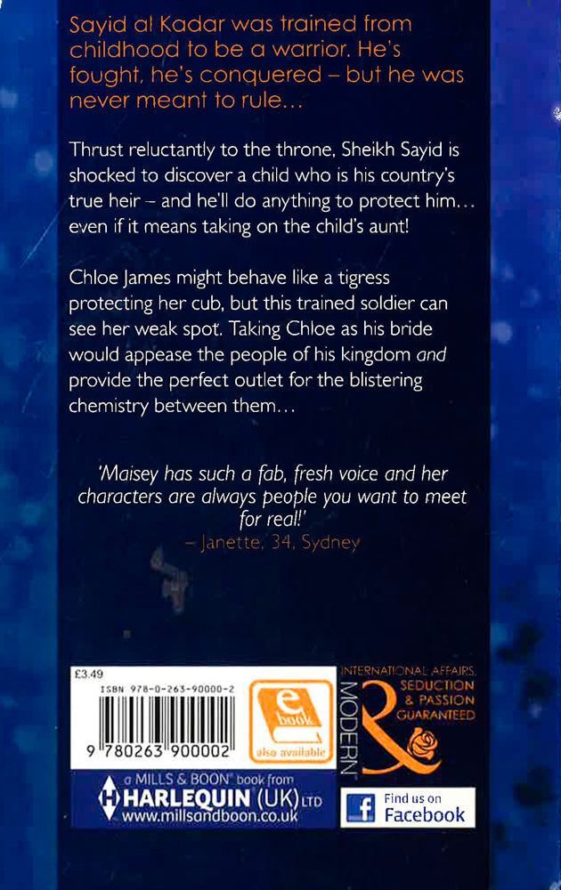 Sayid al Kadar was trained from childhood to be a warrior. He's fought, he's conquered - but he was never meant to rule... Thrust reluctantly to the throne, Sheikh Sayid is shocked to discover a child who is his country's true heir - and he'll do anything to protect him...even if it means taking on the child's aunt! Chloe James might behave like a tigress protecting her cub, but this trained soldier can see her weak spot. Taking Chloe as his bride would appease the people of his kingdom and provide the perfect outlet for the blistering chemistry between them... `Maisey has such a fab, fresh voice and her characters are always people you want to meet for real!' - Janette, 34, Sydney