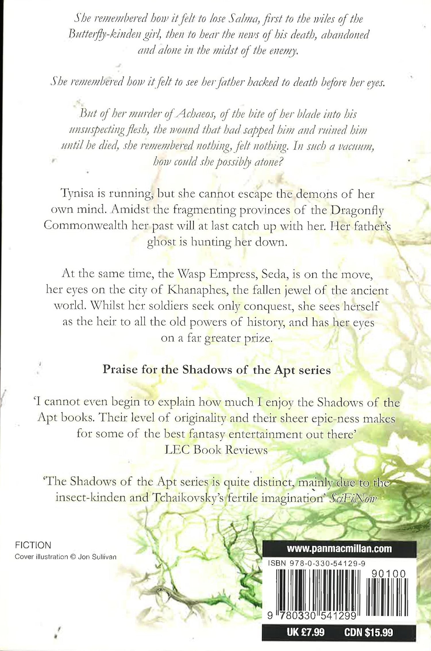 She remembered how it felt to lose Salma, first to the wiles of the Butterfly-kinden girl, then to hear the news of his death, abandoned and alone in the midst of the enemy. She remembered how it felt to see her father hacked to death before her eyes. But of her murder of Achaeos, of the bite of her blade into his unsuspecting flesh, the wound that had sapped him and ruined him until he died, she remembered nothing, felt nothing. In such a vacuum, how could she possibly atone? Tynisa is running, but she cannot escape the demons of her own mind. Amidst the fragmenting provinces of the Dragonfly Commonweal her past will at last catch up with her. Her father's ghost is hunting her down. At the same time, the Wasp Empress, Seda, is on the move, her eyes on the city of Khanaphes, the fallen jewel of the ancient world. Whilst her soldiers seek only conquest, she sees herself as the heir to all the old powers of history, and has her eyes on a far greater prize.