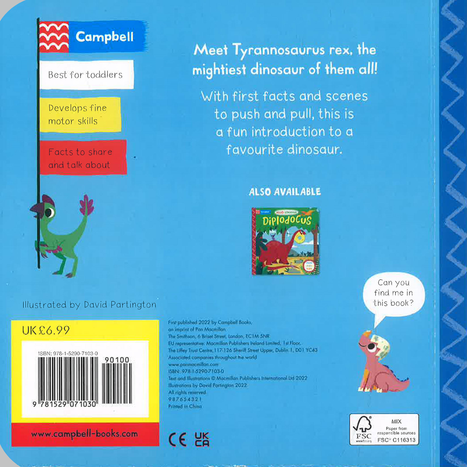 Bright, bold illustrations by David Partington bring Tyrannosaurus rex and his dinosaur friends to life. With lots to talk about on every page and fun facts to share too, this is the perfect first introduction for inquisitive toddlers to a favourite dinosaur.