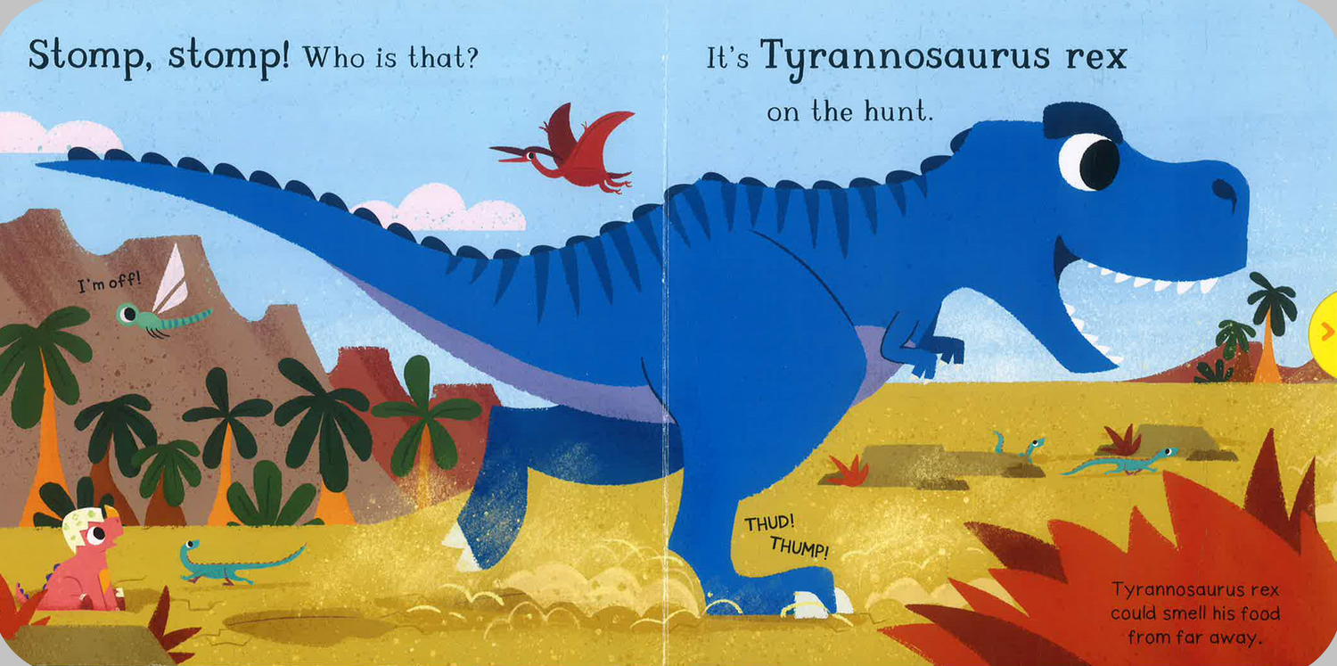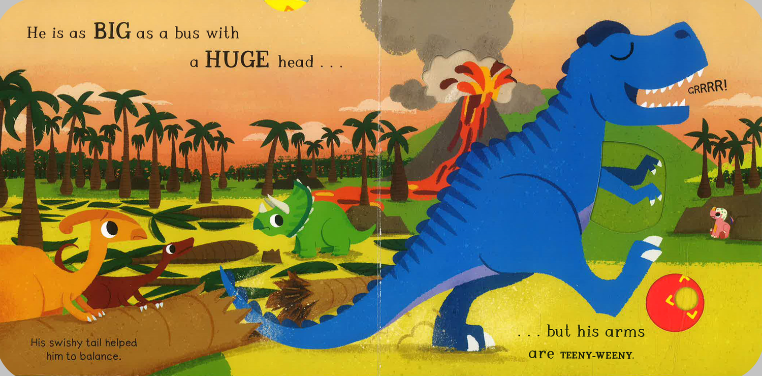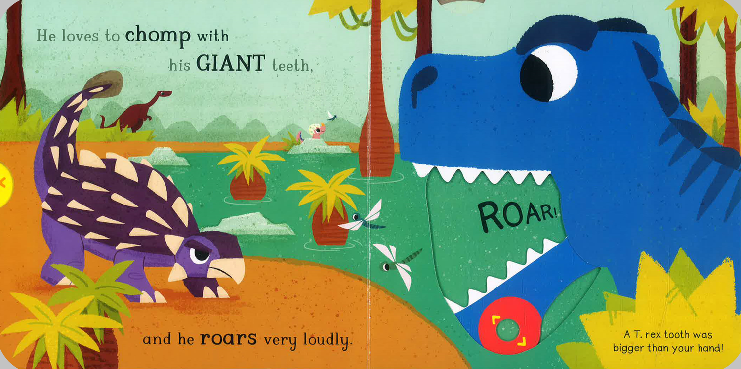 Push, pull and slide the scenes to meet Tyrannosaurus rex, the mightiest dinosaur of them all! Watch as stomps and roars, before asking the other dinos to play a game.