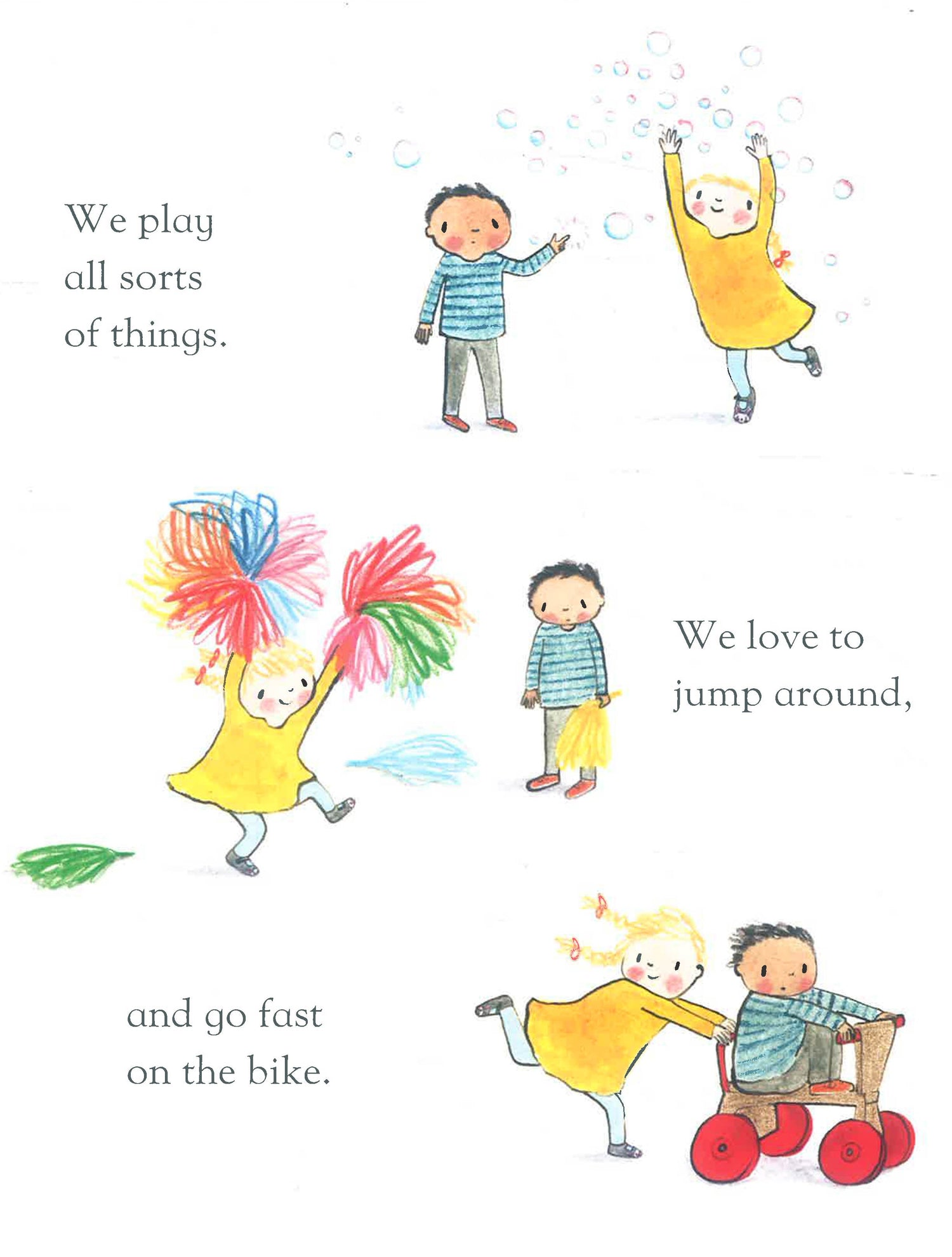 Hello Friend! tells the story of one big-hearted and enthusiastic little girl who is insistent on making friends with a certain little boy. And why wouldn't he want to be friends with her? She's very good at sharing – even if it's a sandwich that he doesn't like. And she's certain that playing outside is their favourite thing to do, even if he is not so sure. But while he doesn't seem keen on many of the things that she loves to do, there is one thing he's very keen on after all . . . being friends.