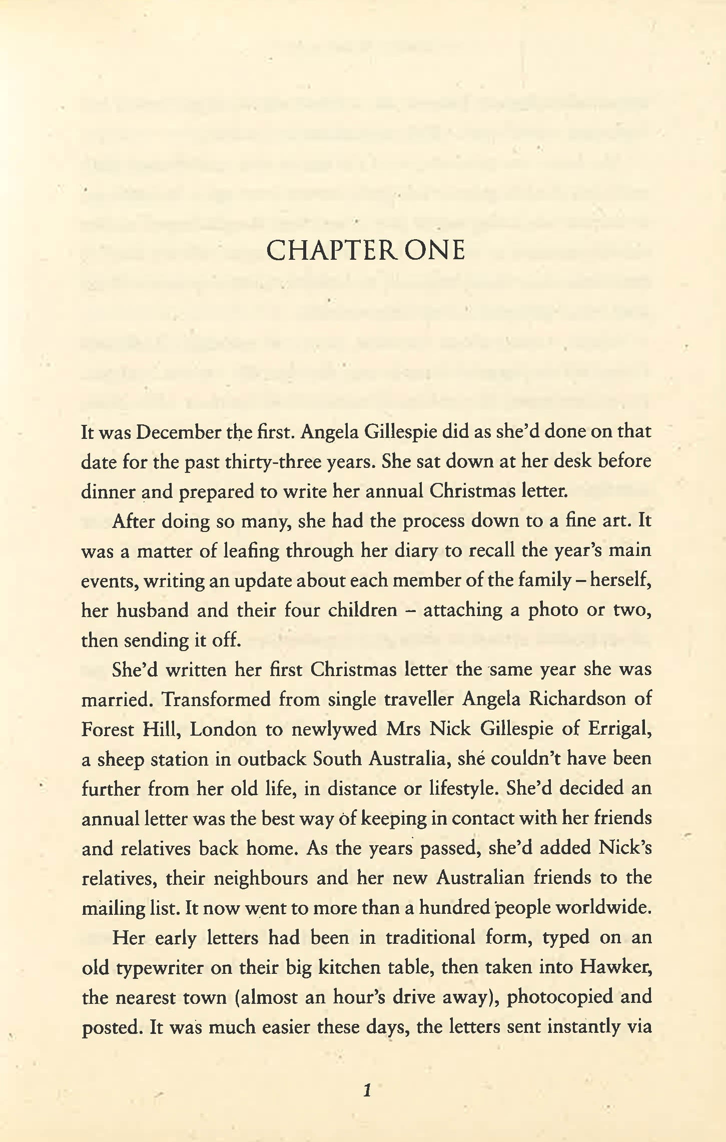 For the last thirty years, Angela Gillespie's annual Christmas letter has been full of her family's triumphs. But this year Angela surprises everyone, including herself - she tells the truth. Angela's husband is in the throes of a mid-life crisis. Her grown-up daughters are more out of control than ever. And her youngest child spends all of his time talking to an imaginary friend. With fantasy thoughts of a life before marriage and motherhood becoming more than just an innocent daydream, Angela's real life is slowly slipping out of focus. But, as the repercussions of her ruthlessly honest letter begin to pile up, a shocking event takes Angela from her family, and she realises she should have been more careful of what she wished for...