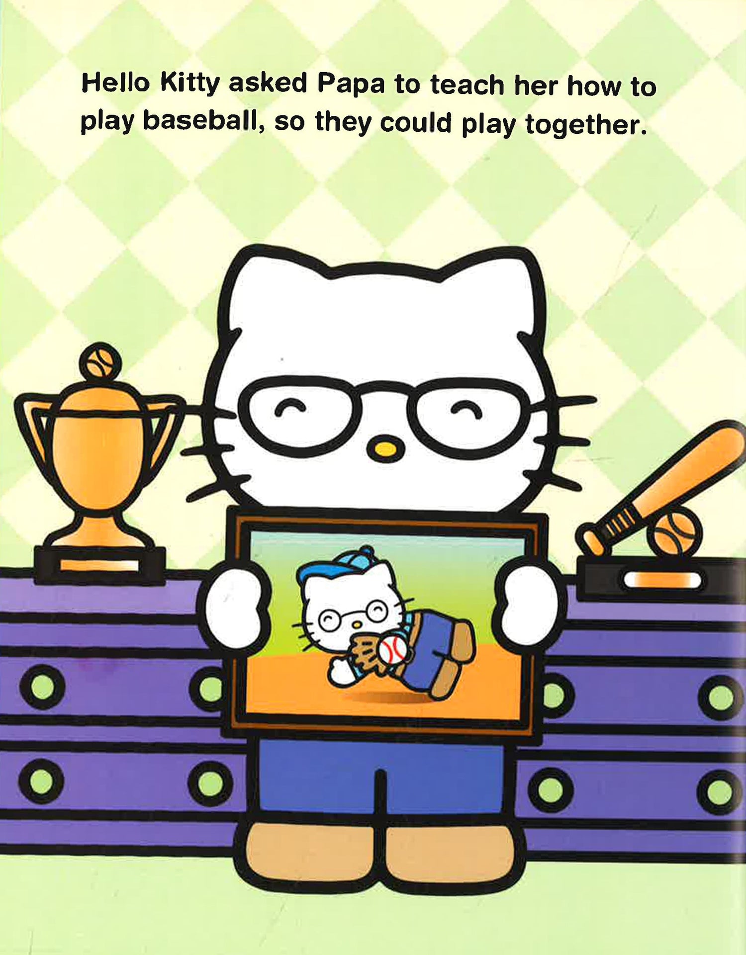 Donning her pink safety helmet, Hello Kitty goes to the park with Papa to learn how to play baseball and, after some practice and perseverance, is soon hitting the ball like a pro!