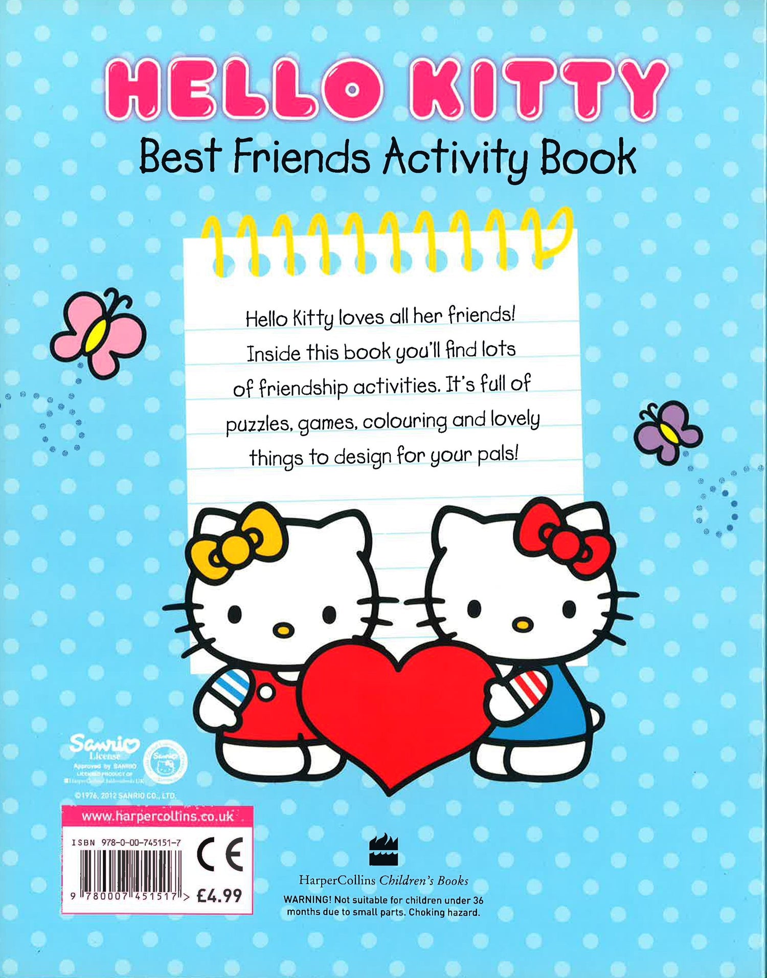 Hello Kitty loves all her friends and making new ones! This book is packed with fun friendship activities and fab pages to fill in with friendship facts. This book is packed with friendship facts and pages to colour and fill in. Hello Kitty tells you all about her friends, shows you how to make a very special friendship bouquet and how to fill out fun friendship cheques. You can also solve puzzles, help Hello Kitty work out how to spend the perfect day with friends, colour in lovely pictures and much much more. This book is perfect for all your friends!