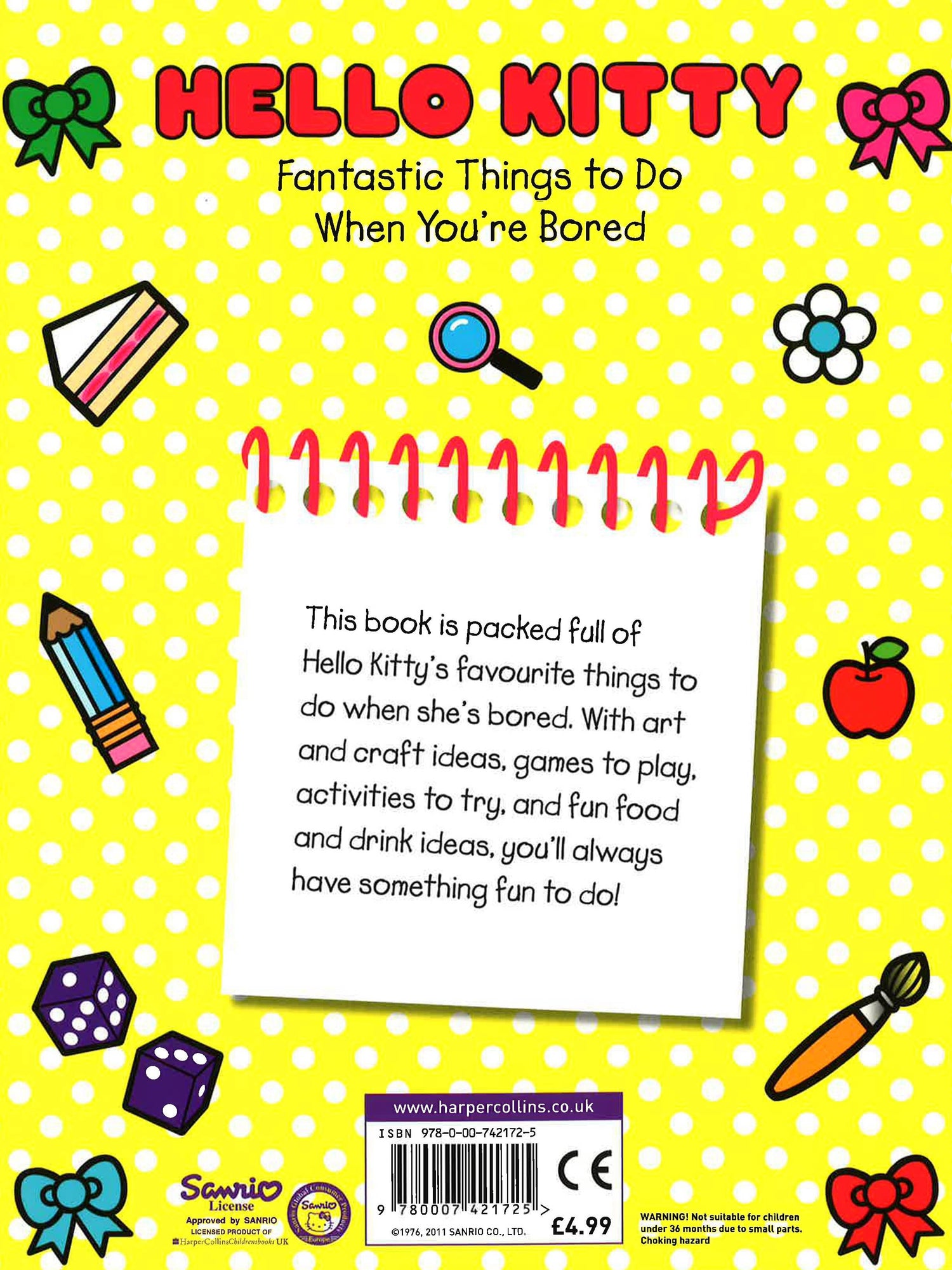 Full of arts and crafts, games and activities. There's lots and lots inside to keep every Hello Kitty fan entertained! This book is packed full of Hello Kitty's favourite things to do when she's bored. With art and craft ideas, games to play with friends, activities to try, and fun food and drink ideas, you'll always have something to do, whatever the weather!