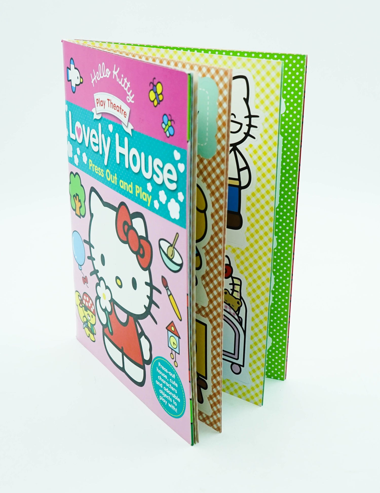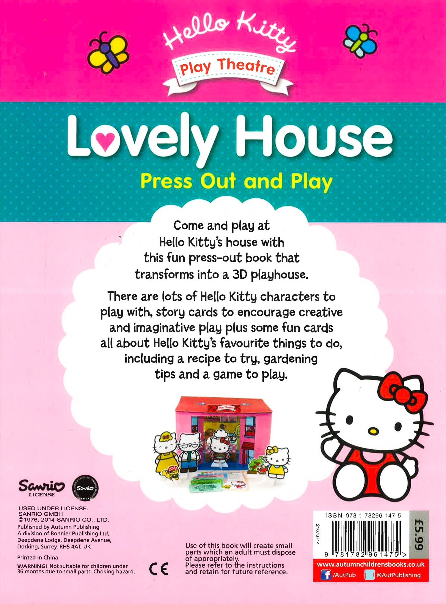 Step into Hello Kitty s lovely world with this press out and play book that transforms into a 3-D house. Simply press out Hello Kitty, her friends and family then detach the cover and slot together to createher lovely house. With a reversible pull-out scene, the theatre can be set for different locations from the kitchen to the living room, then a garden complete with plants and grass, before finally becoming Hello Kitty s bedroom at the end of her busy day. There are pages characters and furniture to press out, storycards, and fun fact cards featuring a cookie recipe, gardening tips and Hello Kitty colouring.