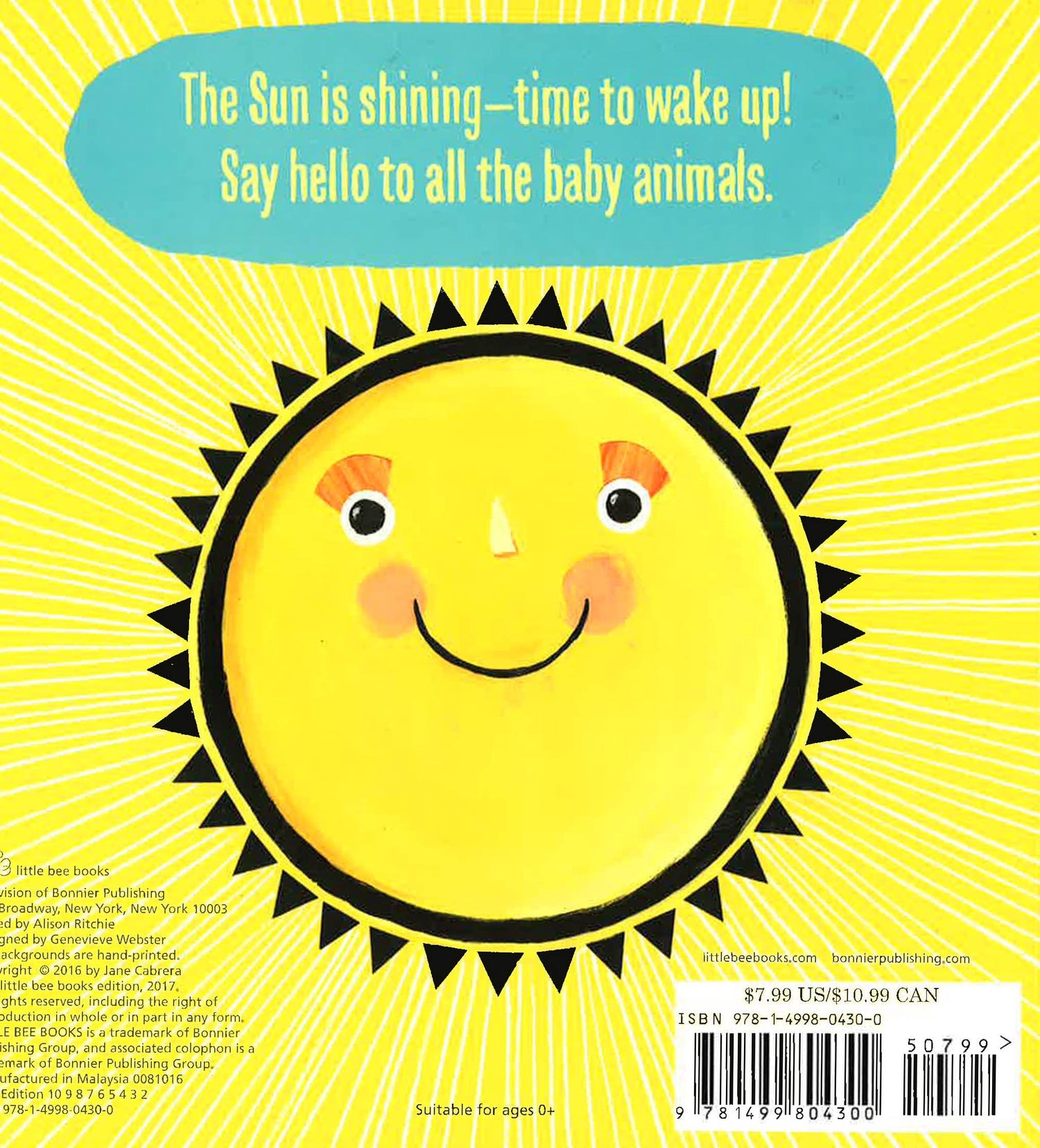 Get baby ready to wake up and say hello to all the different animals in this adorable board book! Hello, sun. Hello, day. Wake up, babies, Time to play! It's time for baby to wake up! Little ones will love greeting all the baby animals with their animal sounds in this adorable board book, including a chick (Cheep Cheep), a piglet (Oink Oink), a puppy (Woof Woof), a frog (Croak Croak), a calf (Moo Moo), a bunny (Twitch Twitch), a lamb (Baa Baa), a bee (Buzz Buzz), and finally, a baby (Goo Goo)!