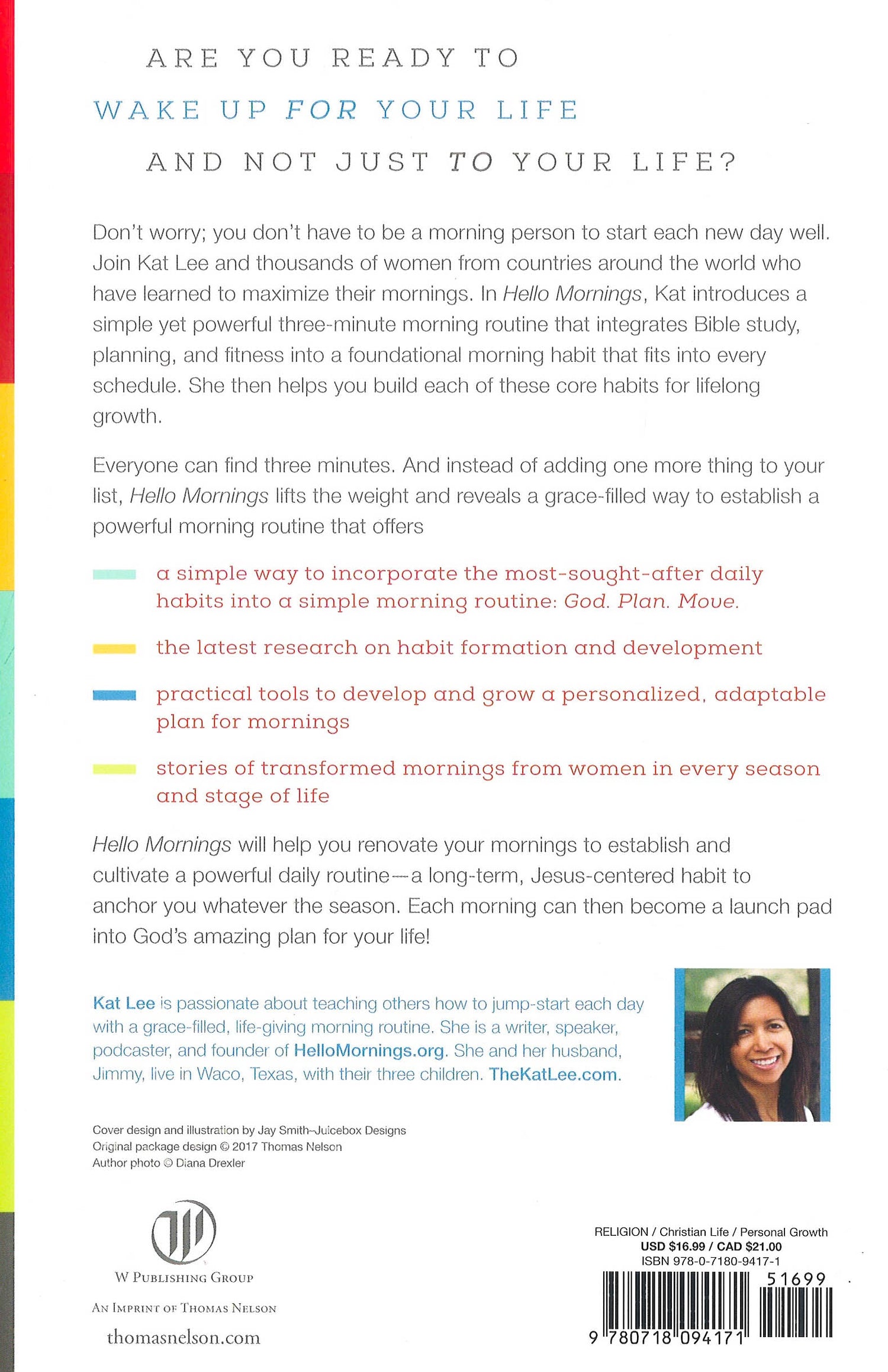 Are you ready to wake up for your life and not just to your life? Don't worry; you don’t have to be a morning person to start each new day well. Join Kat Lee and thousands of women from countries around the world who have learned to maximize their mornings. In Hello Mornings, Kat introduces a simple yet powerful three-minute morning routine that integrates Bible study, planning, and fitness into a foundational morning habit that fits into every schedule. She then helps you build each of these core habits for life-long growth. Everyone can find three minutes. And instead of adding one more thing to the list, Hello Mornings lifts the weight off women by revealing a grace-filled way to establish a powerful morning routine that offers • a simple way to incorporate the most-sought-after daily habits into a simple morning routine: God. Plan. Move. • the latest research on habit formation and development • practical tools to help readers develop and grow their own personalized, adaptable plan for mornings • stories of transformed mornings from women in every season and stage of life Hello Mornings helps readers renovate their mornings to establish and grow a powerful daily routine - a long-term, Jesus-centered habit to anchor them in every season. Each morning can then become a launch pad into God’s amazing plan for their lives.