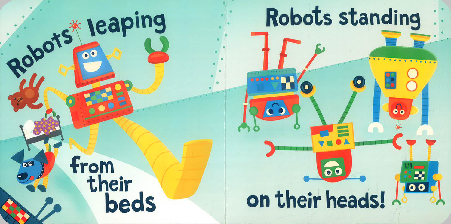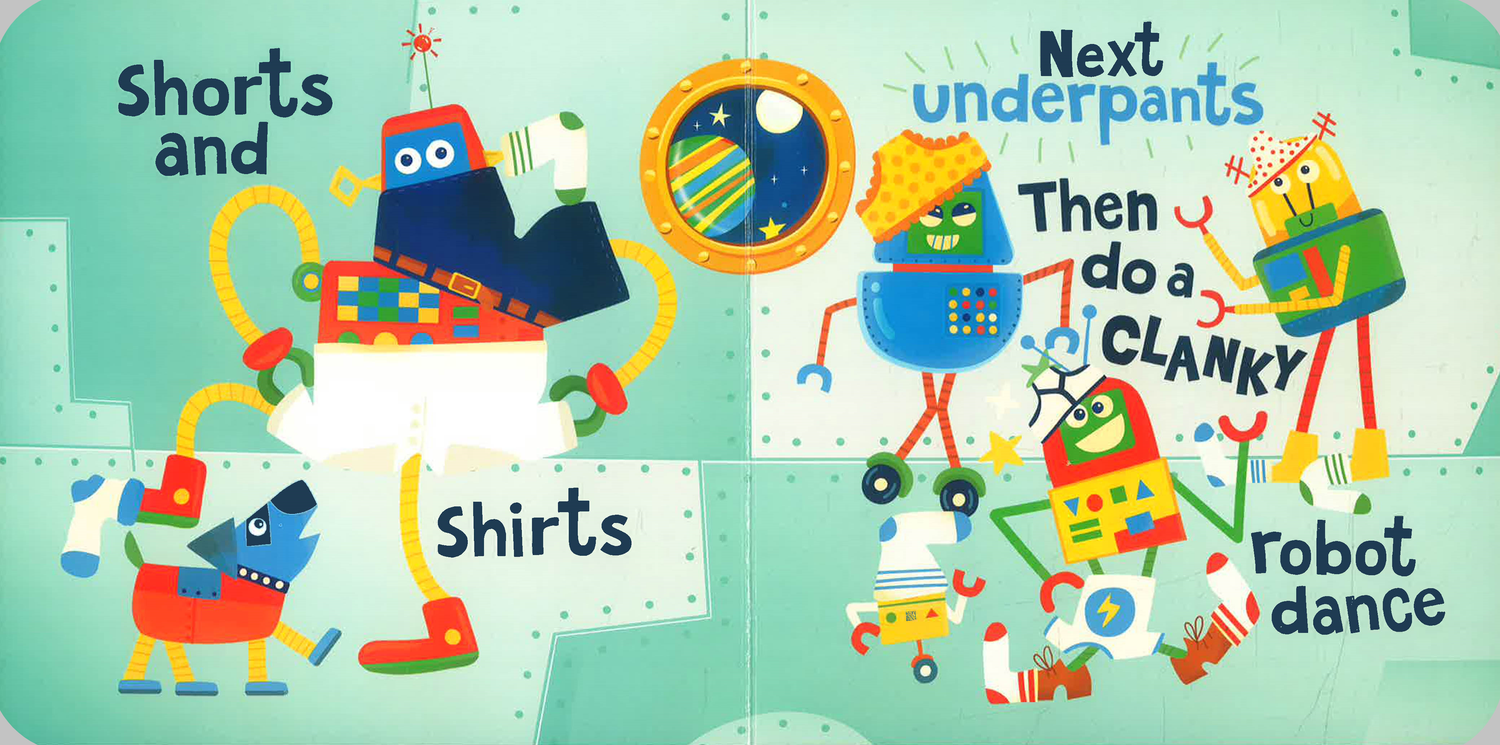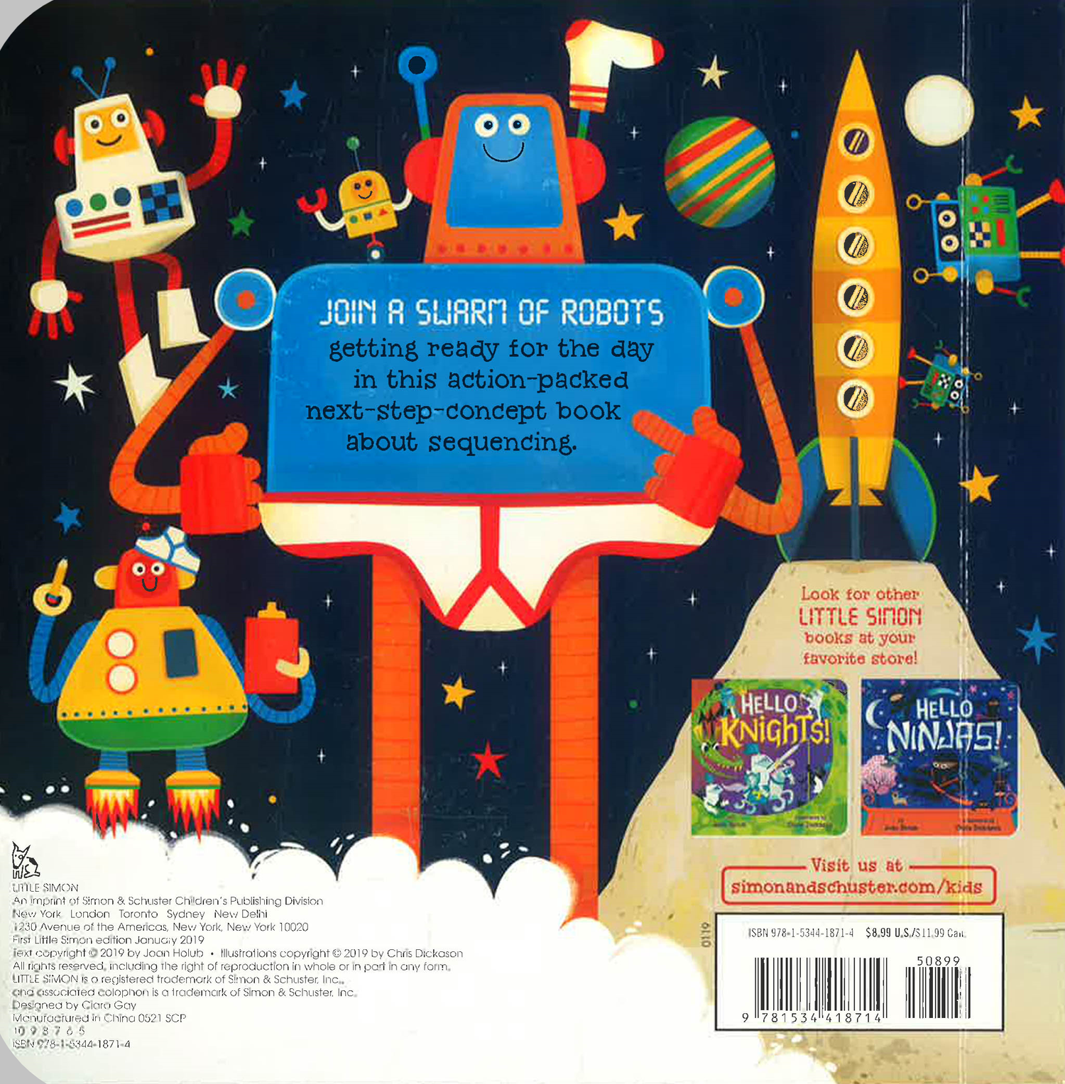 New from beloved author Joan Holub, Hello Robots! is a fun, playful board book about robots and sequencing!Hello Buzz. Hello Beep. Hello robots fast asleep. Wake up! Get dressed, robots! Perfect for reading out loud, Joan Holub’s hilarious text and Chris Dickason’s lively illustrations will have little ones learning and laughing as they try to help sleepy robots complete their morning routine in the correct order. A clever, interactive approach to first concepts, the Hello board book series introduces important “next-step” concepts like sequencing in a hilariously engaging way.