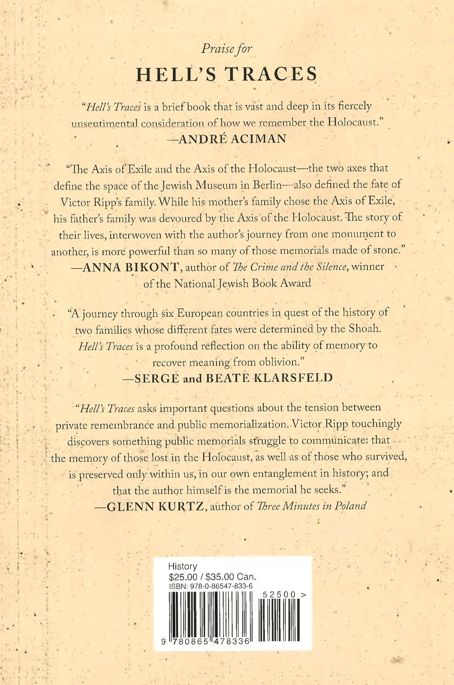 In July 1942, the French police in Paris, acting for the German military government, arrested Victor Ripp’s three-year-old cousin, Alexandre. Two months later, the boy was killed in Auschwitz. In Hell’s Traces, Ripp examines this act through the prism of family history. In addition to Alexandre, ten members of Ripp’s family on his father’s side died in the Holocaust. His mother’s side of the family, numbering thirty people, was in Berlin when Hitler came to power. Without exception they escaped the Final Solution.Hell’s Traces tells the story of the two families’ divergent paths. To spark the past to life, he embarks on a journey to visit Holocaust memorials throughout Europe. “Could a stone pillar or a bronze plaque or whatever else constitutes a memorial,” he asks, “cause events that took place more than seven decades ago to appear vivid?”A memorial in Warsaw that includes a boxcar like the ones that carried Jews to Auschwitz compels Ripp to contemplate the horror of Alexandre’s transport to his death. One in Berlin that invokes the anti-Jewish laws of the 1930s allows him to better understand how his mother’s family escaped the Nazis. In Paris he stumbles across a playground dedicated to the memory of the French children who were deported, Alexandre among them. Ultimately, Ripp sees thirty-five memorials in six countries. He encounters the artists who designed the memorials, historians who recall the events that are memorialized, and survivors with their own stories to tell.Resolutely unsentimental, Hell’s Traces is structured like a travelogue in which each destination enables a reckoning with the past.