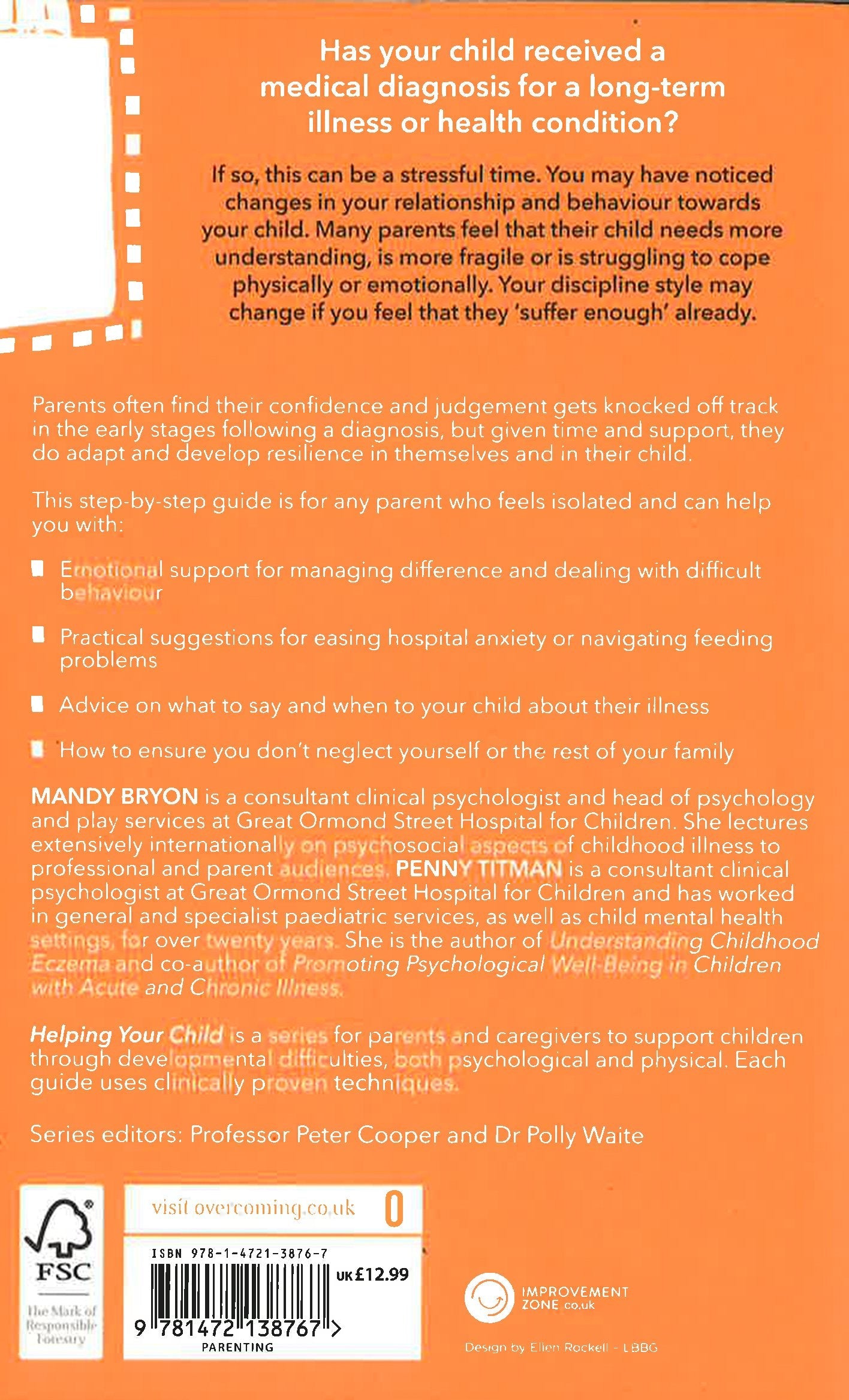 Has your child received a medical diagnosis for a long term illness or health condition? If so, this can be a stressful time for you both. You may have noticed changes in your relationship and behaviour towards your child. For example many parents feel that their child needs more understanding, is more fragile or is struggling to cope physically or emotionally. Your discipline parenting style may change if you feel that they 'suffer enough' already. Parents often find their confidence and judgement gets knocked off track in the early stages following a diagnosis, but given time and support, they do adapt and develop resilience in themselves and in their child. This book can help you with: * Emotional support for managing difference and dealing with difficult behaviour, Practical suggestions for easing hospital anxiety or navigating feeding problems, Advice on what to say and when to your child about their illness, How to ensure you don't neglect yourself or the rest of your family. Written by experts in childhood illness, this step-by-step guide is for any parent who feels isolated or lacking in support. Helping Your Child is a series for parents and caregivers to support children through developmental difficulties, both psychological and physical. Each guide uses clinically proven techniques.