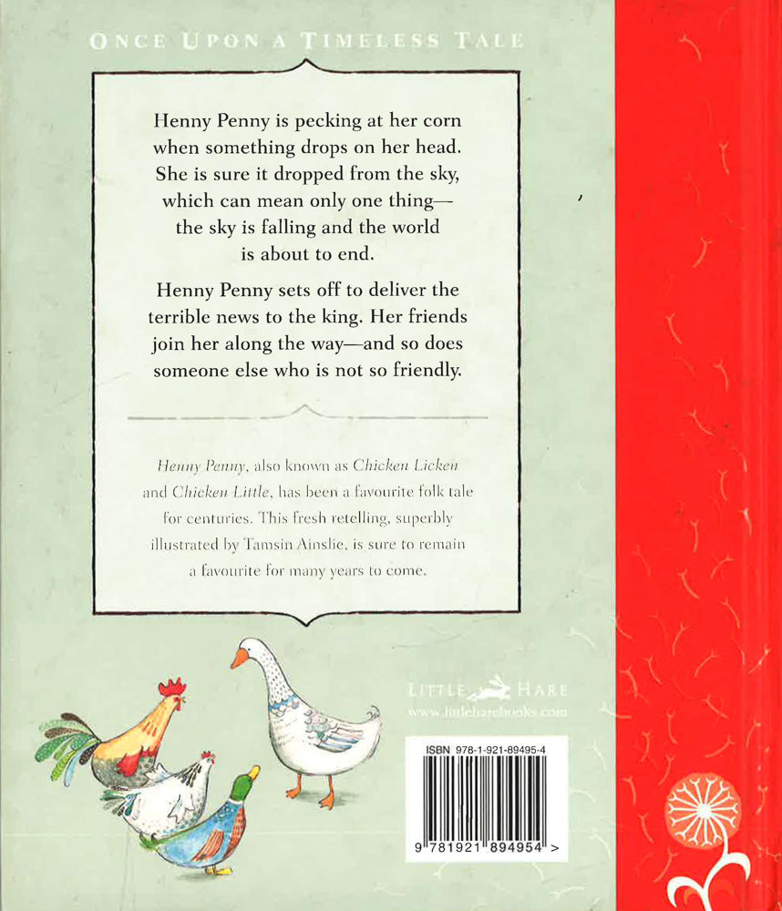Henny Penny is pecking at her corn when something drops on her head. She is sure it dropped from the sky, which can only mean one thing - the sky is falling and the world is about to end./Henny Penny sets off to deliver the terrible news to the king. Her friends join her along the way - and so does someone else who is not so friendly./Henny Penny, also known as Chicken Licken and Chicken Little, has been a favourite folk tale for centuries. This fresh retelling, superbly illustrated by Tamsin Ainslie, is sure to remain a favourite for many years to come.