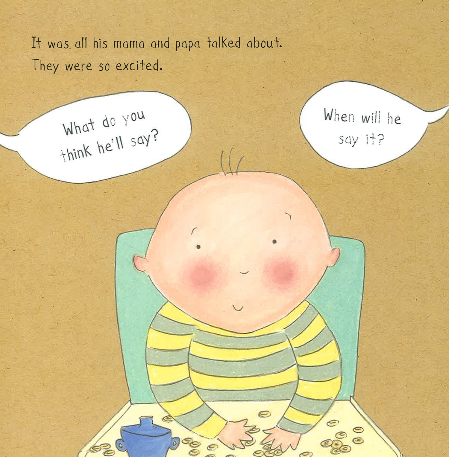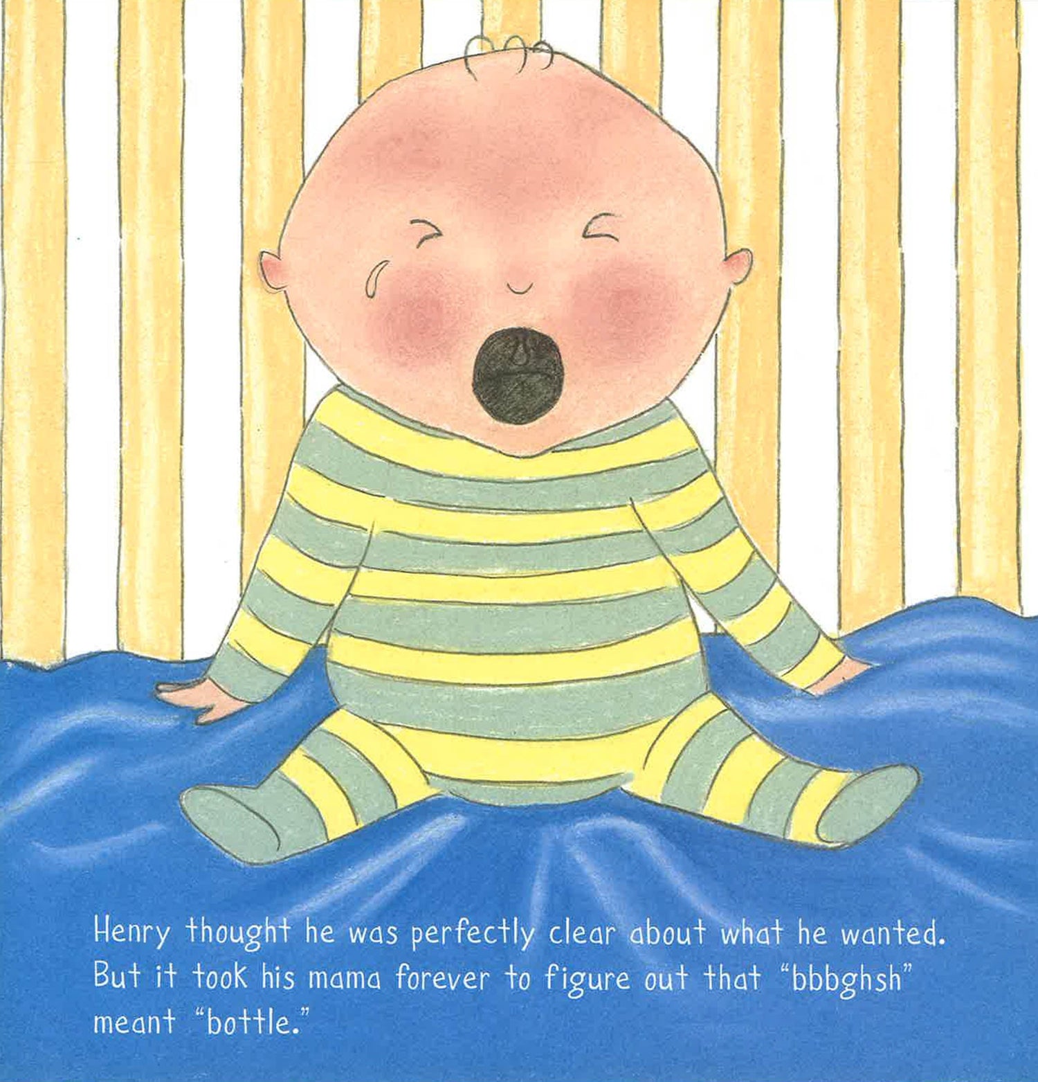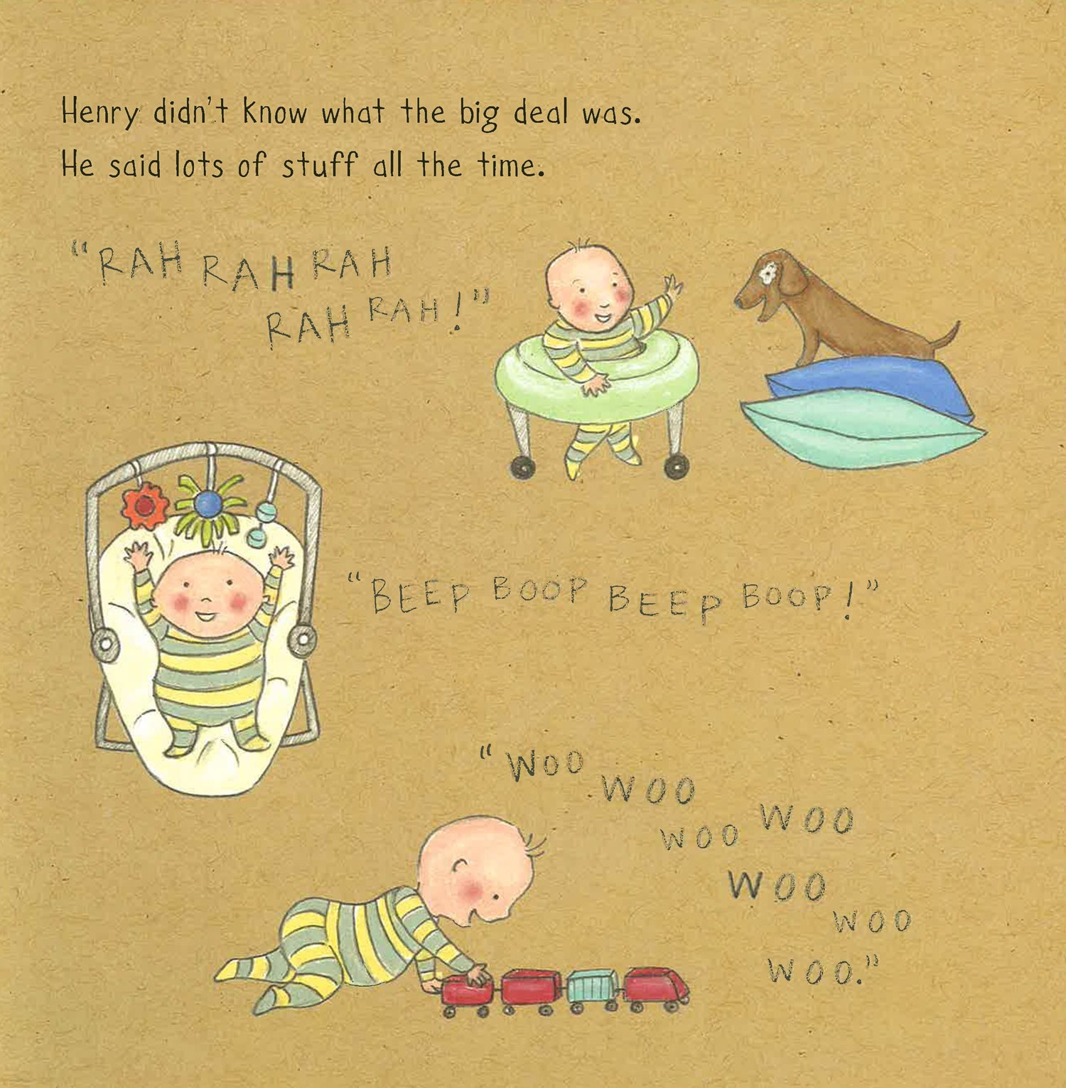 New moms and their babies will love watching Henry say his first word Baby Henry is under a lot of pressure to say his first word. His parents are all excited about what it will be, but Henry doesn't see what the big deal is. He says things all the time like "bbbghsh" and "boop," but no one seems to understand what he means. So, Henry decides that he better start searching for a word. Luckily, just when he needs it most, his first word comes looking for him. This picture book about learning to talk is the perfect gift for new parents and big brothers and sisters. Watching Henry hit this developmental milestone is a treat, and new moms will melt when they find out what Henry's first word is.
