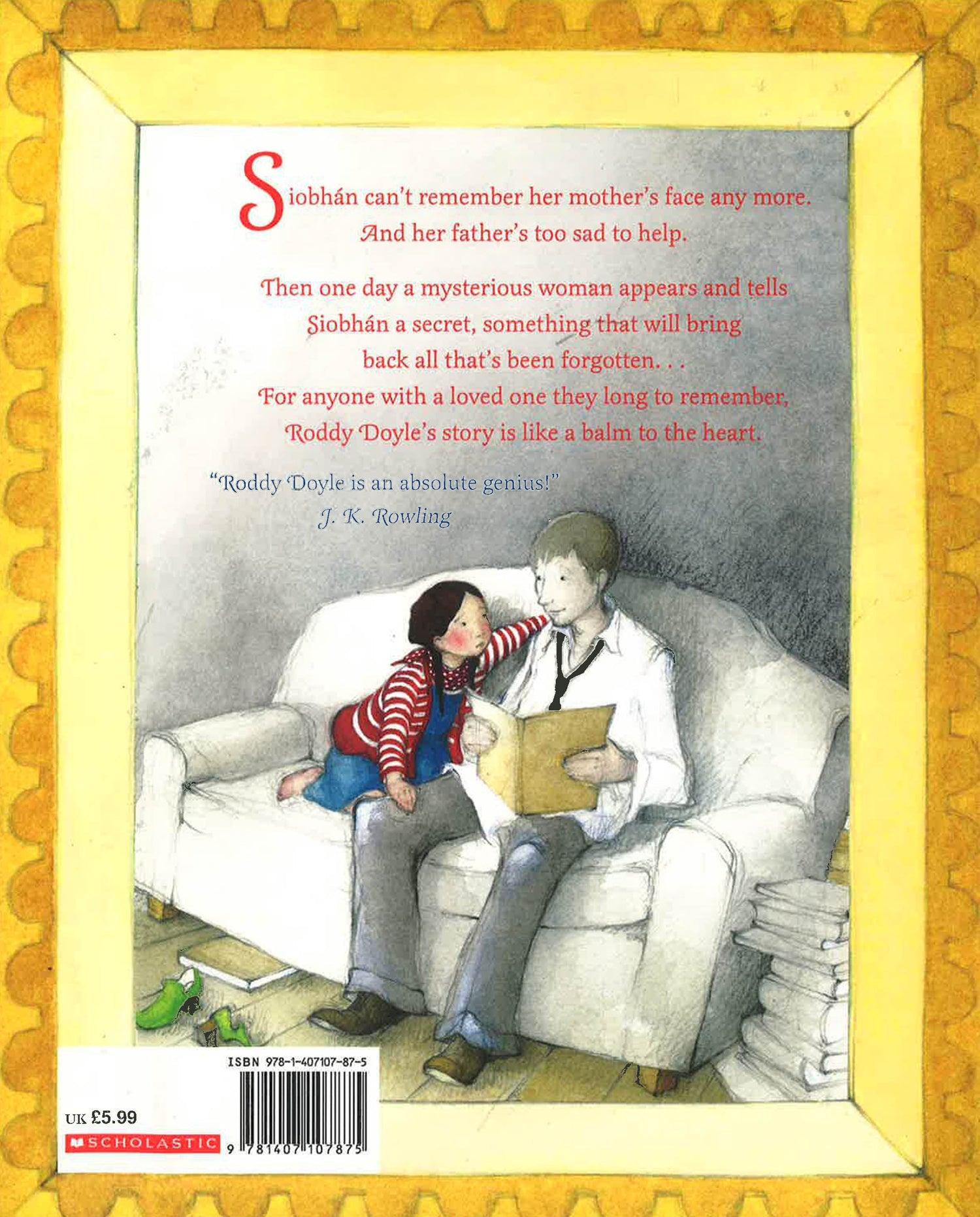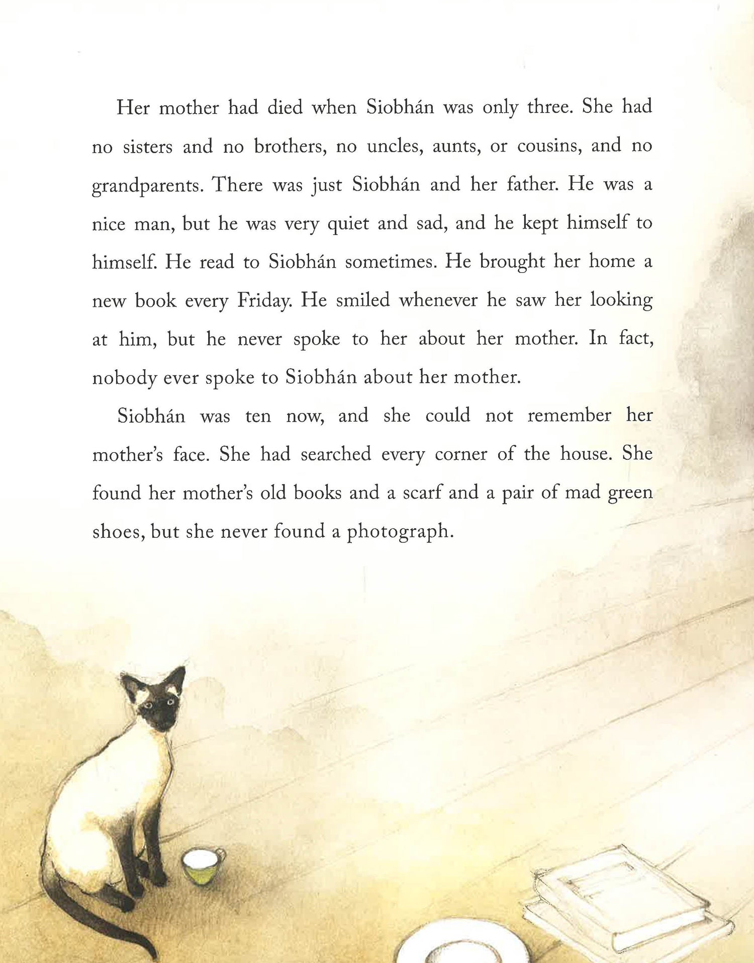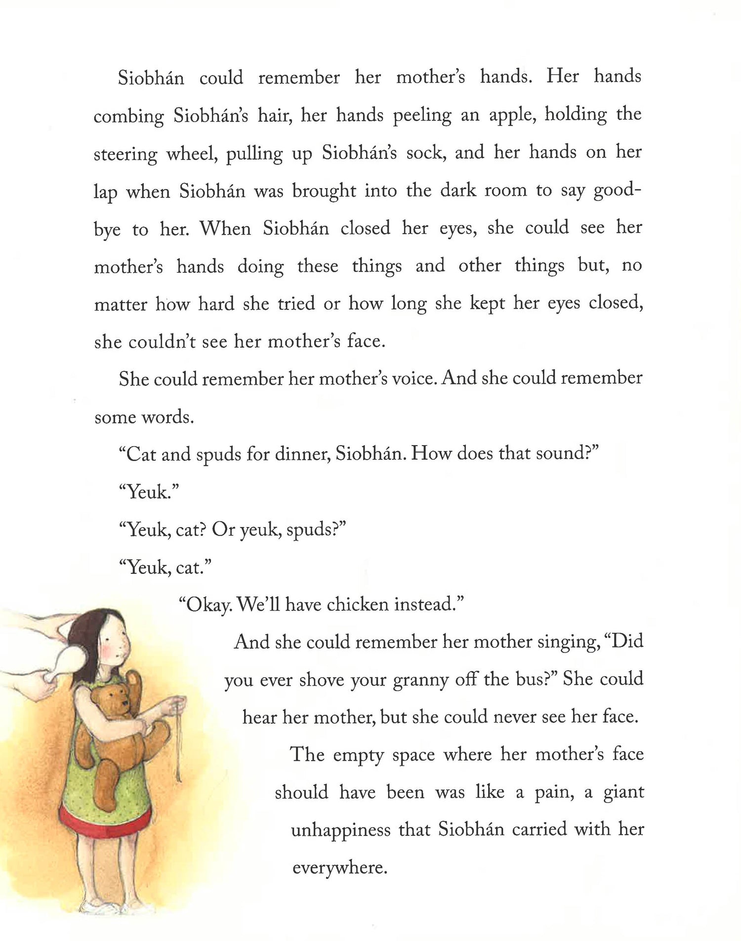 Siobhan missed her mother dearly. Ever since she had gone, she spent her days reminiscing about the time they spent together. She remembered her mother's voice singing and her mother's hands combing her hair, but no matter how hard Siobhan tried she could never see her mother's face.