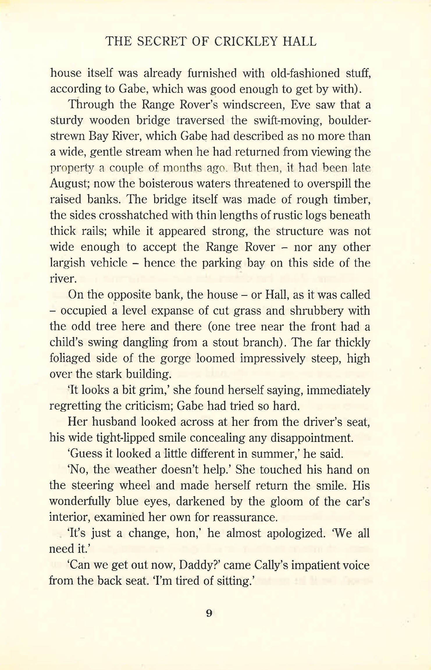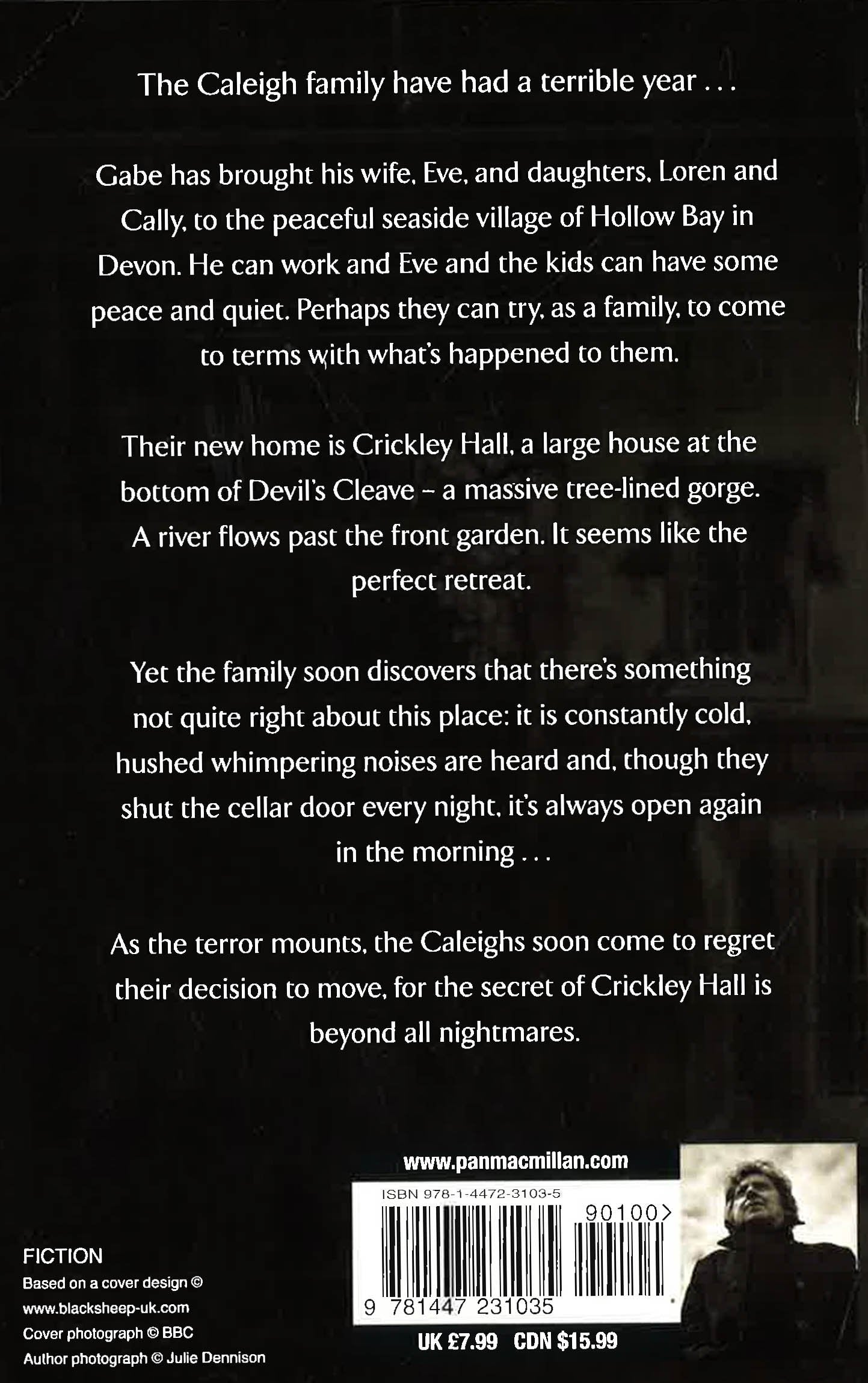 Crickley Hall is an unusually large house on the outskirts of the village at the bottom of Devil's Cleave, a massive tree-lined gorge - the stuff of local legend. A river flows past the front garden. It's perfect for them . . . if a bit gloomy. And Chester, their dog, seems really spooked at being away from home. And old houses do make sounds. And it's constantly cold. And even though they shut the cellar door every night, it's always open again in morning . . .