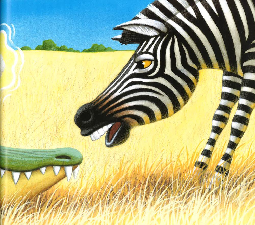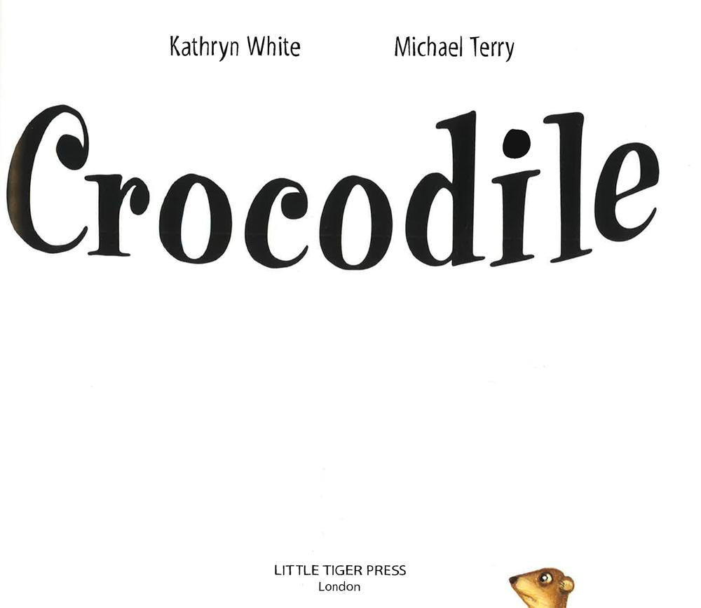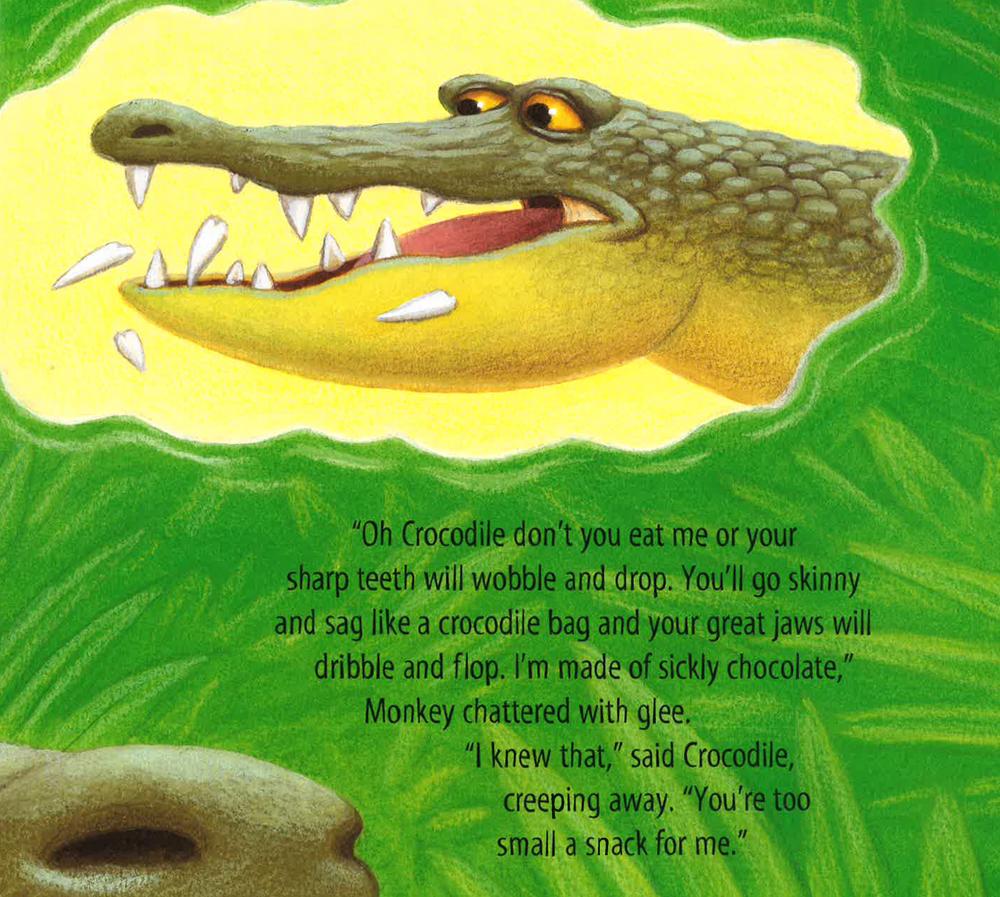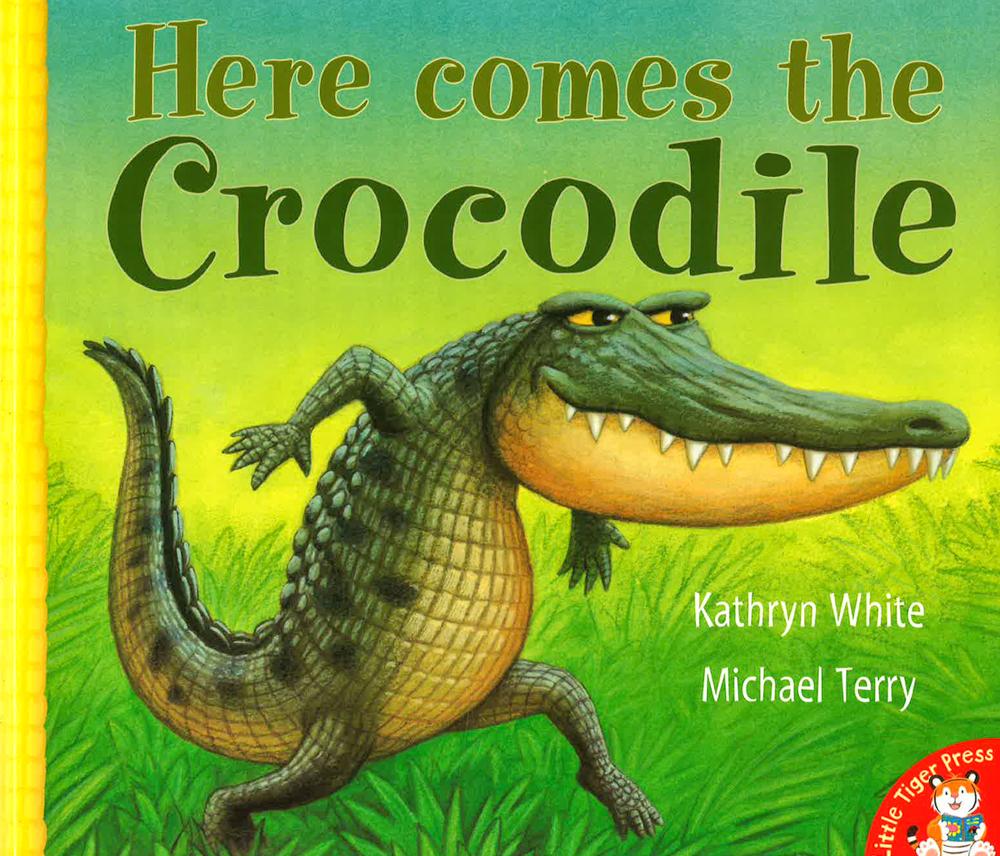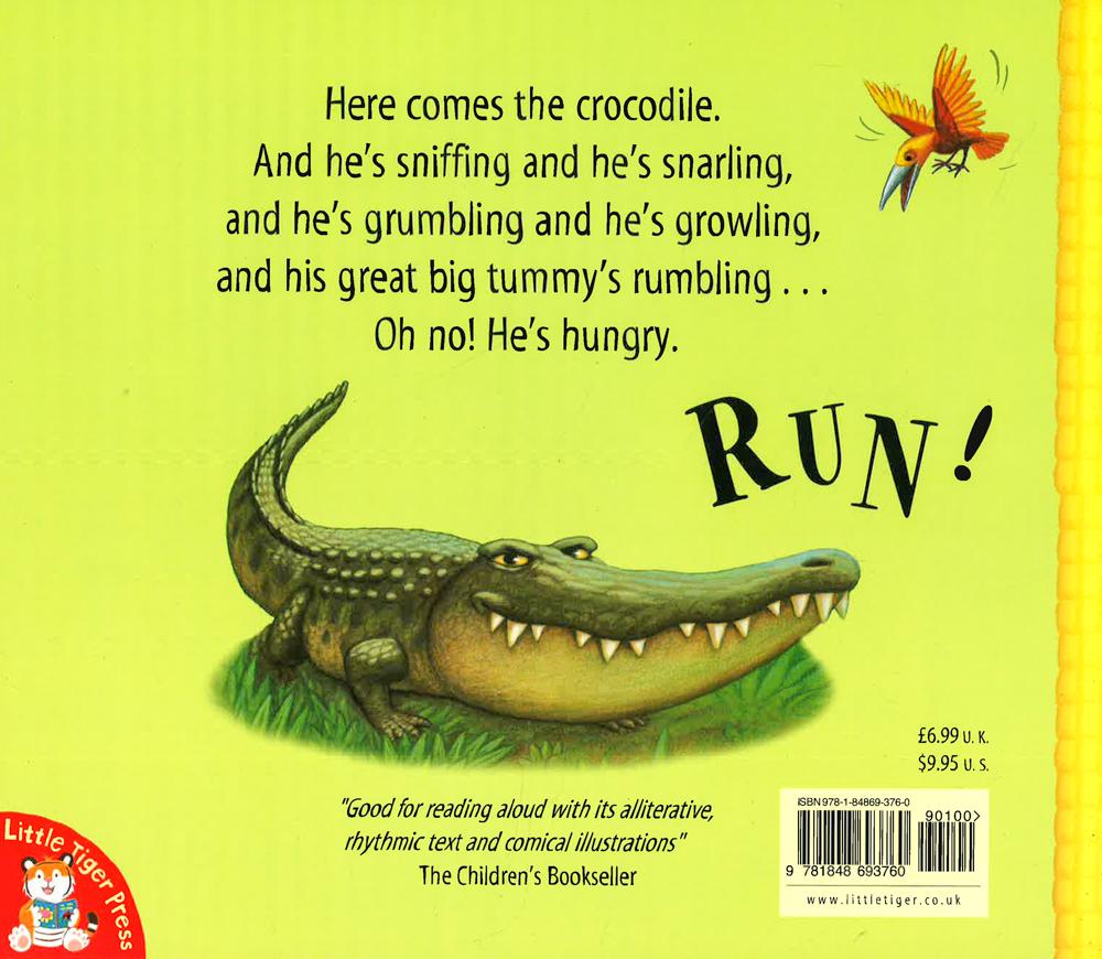 Here comes the crocodile. And he's sniffing and he's snarling, and he's grumbling and he's growling, and his great big tummy's rumbling. Oh no! He's hungry. Run!