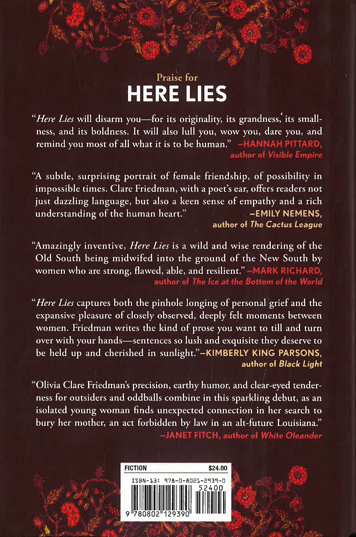 With poignance, poeticism, and deep insight in Here Lies, Olivia Clare Friedman gives us a stunning portrait of motherhood, friendship, and humanity in an alternate American South torn asunder by global warming. This is a stunning first novel from a unique and inventive writer.