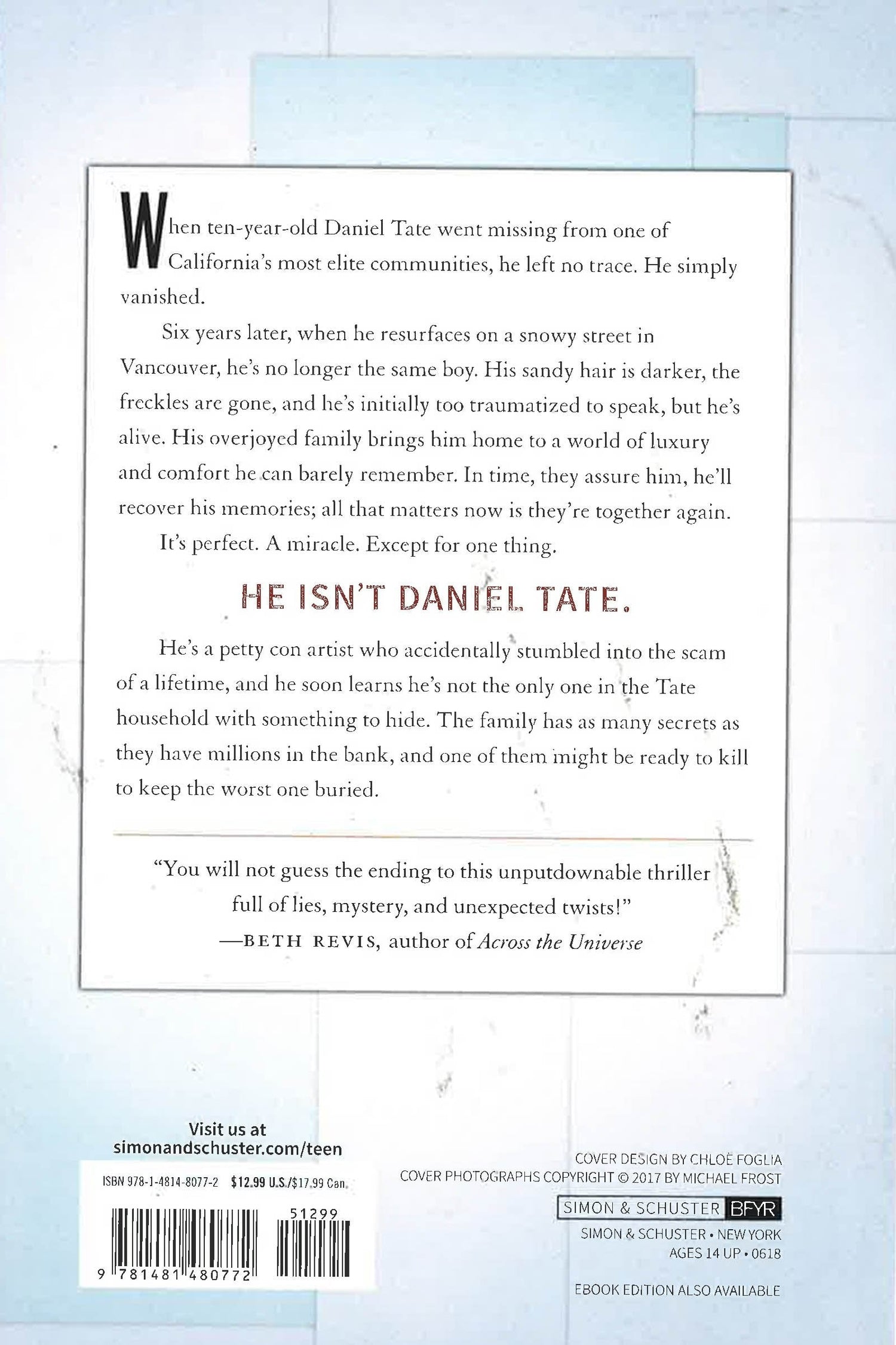 A young, street-savvy runaway looking for a place to call home realizes he might have conned his way into the wrong family in this "unique suspense novel with twists and turns that will keep readers guessing" (School Library Journal) from award-winning author Cristin Terrill. It seems too good to be true when Daniel Tate, missing since he was abducted from one of California's most elite private enclaves at the age of ten, turns up on a snowy street in Vancouver six years later. At first too traumatized to speak, he is eventually able to tell the authorities who he is and is reunited with his overjoyed family. In time, they tell him, he'll recover the memories he's missing; all that matters is that they have him back. It's perfect. A miracle. Except for one thing: That boy isn't Daniel Tate. But he wants to be. A young con artist who's been taking on false identities for years, this impostor has stumbled onto the scam of a lifetime. Daniel has everything he's ever dreamed of--wealth, privilege, the chance to make a fresh start, and most importantly, a family that loves him. Now that he's finally found a place to belong, he doesn't question his luck. Until he realizes that maybe Daniel isn't missing at all. Maybe someone knows what really happened to the boy he's pretending to be...and if he can't uncover the truth--he could be next the next Daniel Tate to disappear.