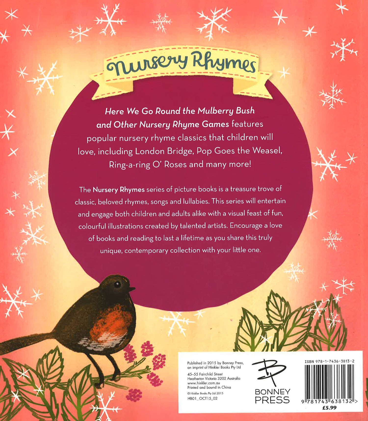Discover this new Bonney Press series of six themed nursery rhyme picture books, featuring a huge range of fun, contemporary illustrations. These bright and colourful books will engage both parents and children, with a variety of art styles and best-loved nursery rhymes creating a collection that is truly unique. This series features classic nursery songs, favourite animal rhymes, fun progressive counting rhymes, traditional action rhymes and playground games, and cherished lullabies.