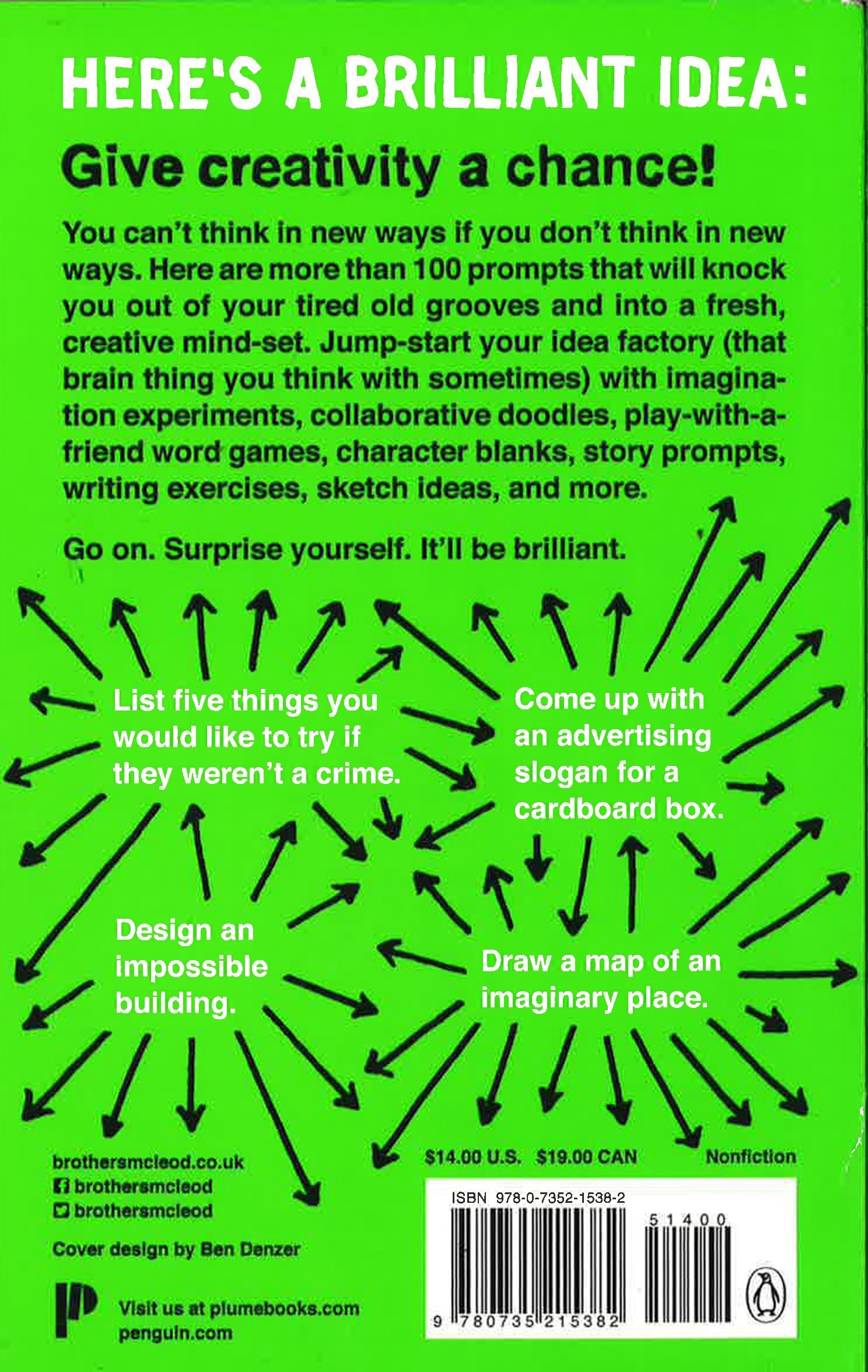 An interactive journal to awaken your creativity. Webby award winning creative team "The Brothers McLeod" deliver 104 prompts designed to kick start your imagination. After all, you can't think in new ways if you don't think in new ways. Whether you're an artist, a writer, or an entrepreneur, these activities will knock you out of your tired old grooves and into a fresh, inventive mindset. Jump-start your idea factory (that brain thing you think with sometimes) with imagination experiments, collaborative doodles, play-with-a-friend word games, character blanks, story prompts, writing exercises, sketch ideas, and more. Go on. Surprise yourself. It'll be brilliant. Sample activities: - List five things you would like to try they weren't a crime. - Come up with an advertising slogan for a cardboard box. - Draw a map of an imaginary place. - Design an impossible building. With delightful (and delightfully creative) illustrations throughout. *This book may have remainder mark*