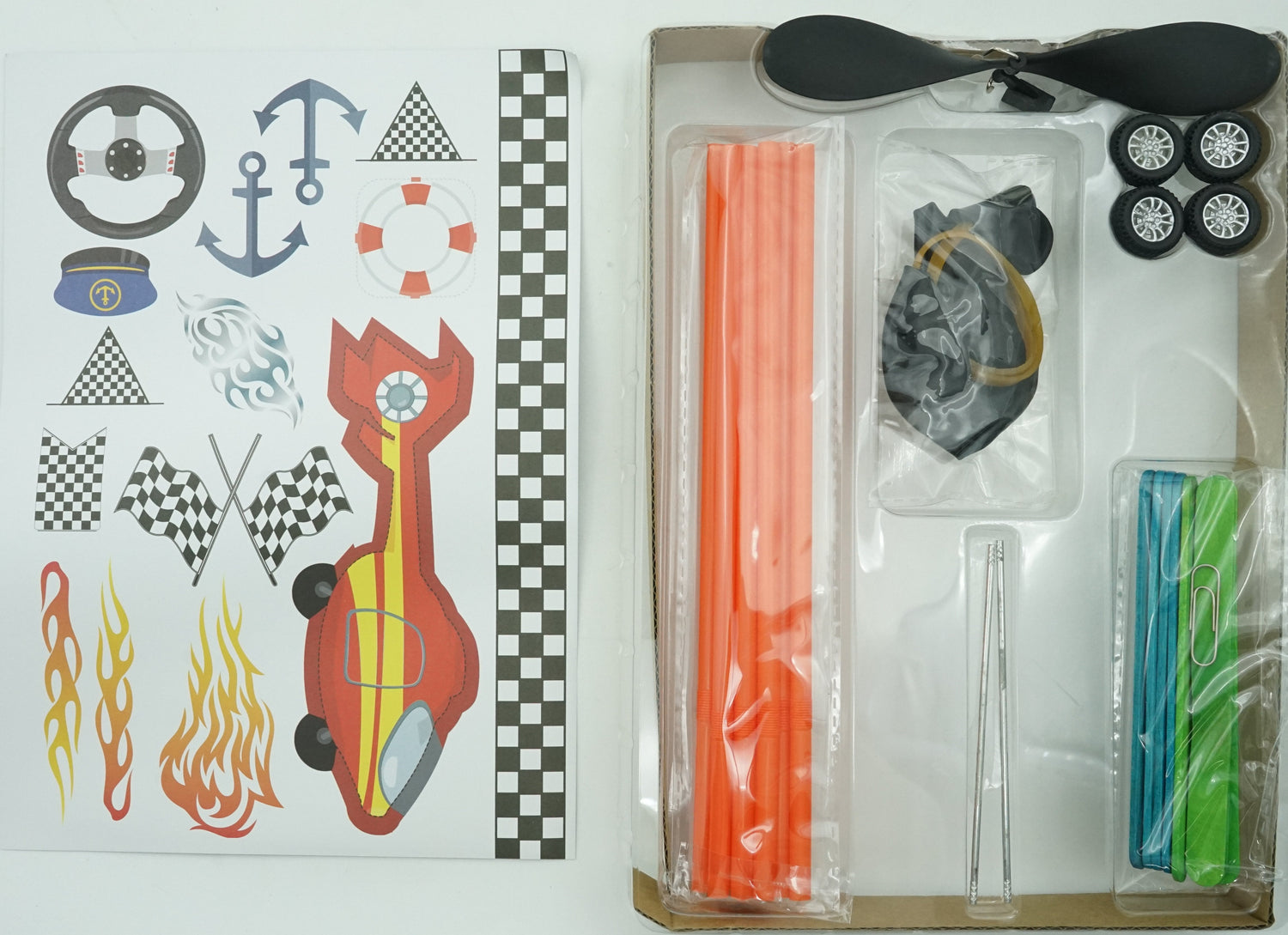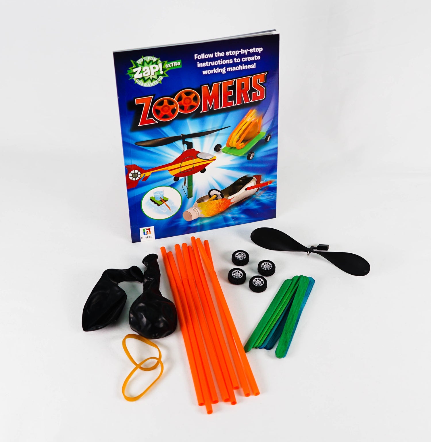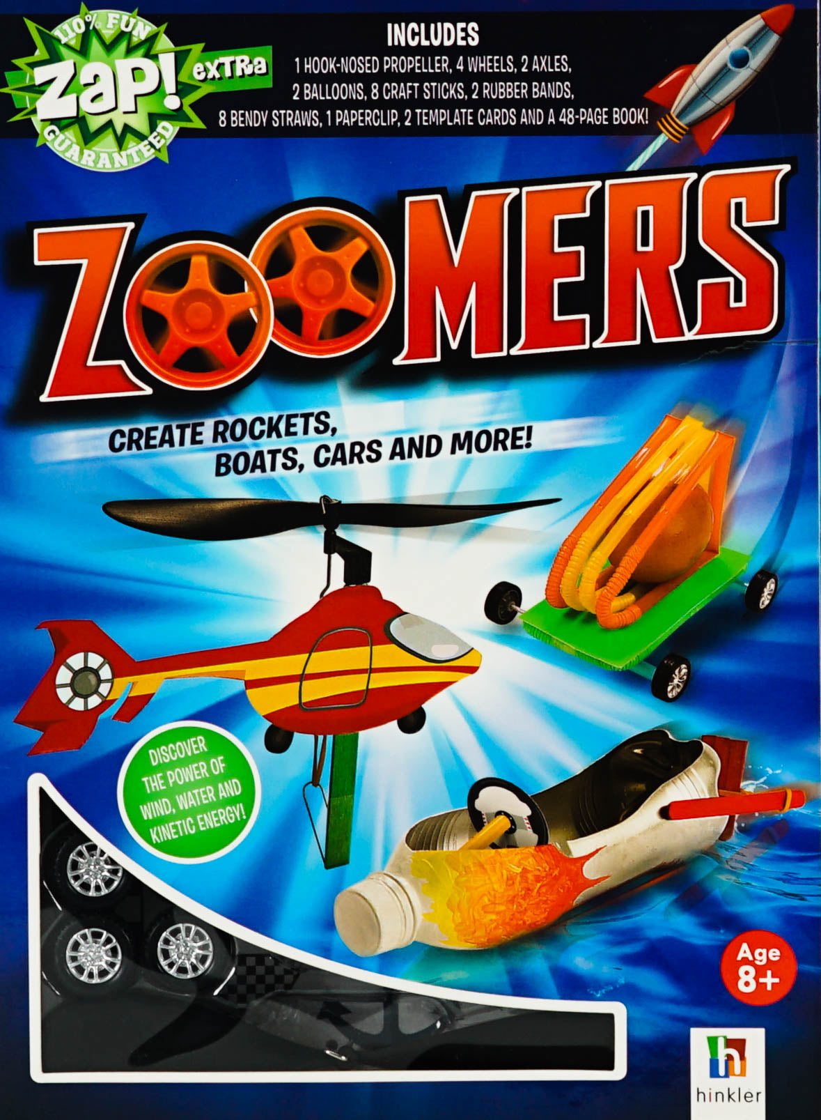 Ever wanted to construct and launch your very own working helicopters, boats and even rockets? Then Zap! Extra Zoomers is for you! Bursting with everything you need to create your own zippy zooming machines, this kit contains a 48-page book with easy-to-follow step-by-step instructions and clear diagrams. With Zap! Extra Zoomers, you can construct and set in motion 13 different vehicles: cars, boats, rockets and other amazing propelling machines. It also includes simple-to-understand explanations of how they work. The sky is no longer the limit! This kit includes: 1 hook-nosed propeller, 4 wheels, 2 axles, 2 balloons, 8 bendy straws, 8 craft sticks, 2 rubber bands, 1 paperclip, 2 template cards and a 48-page book.
