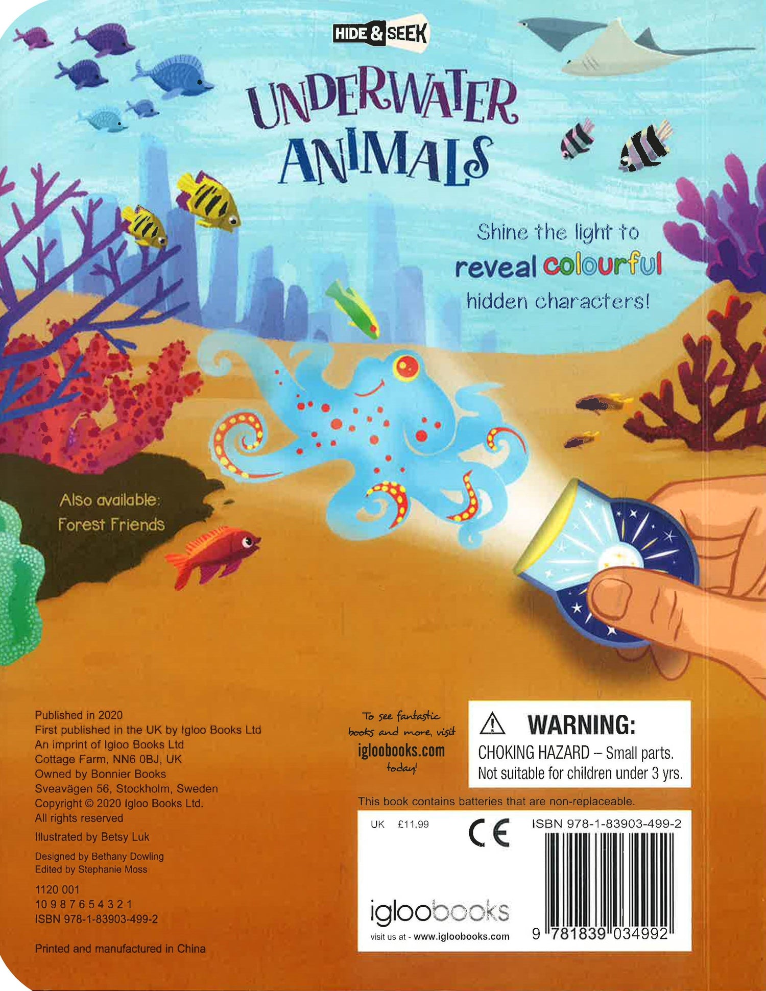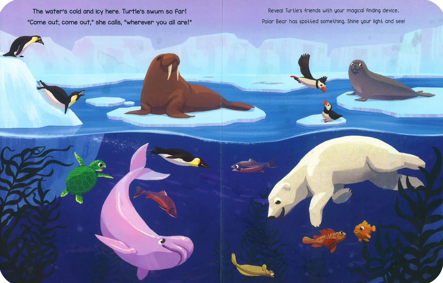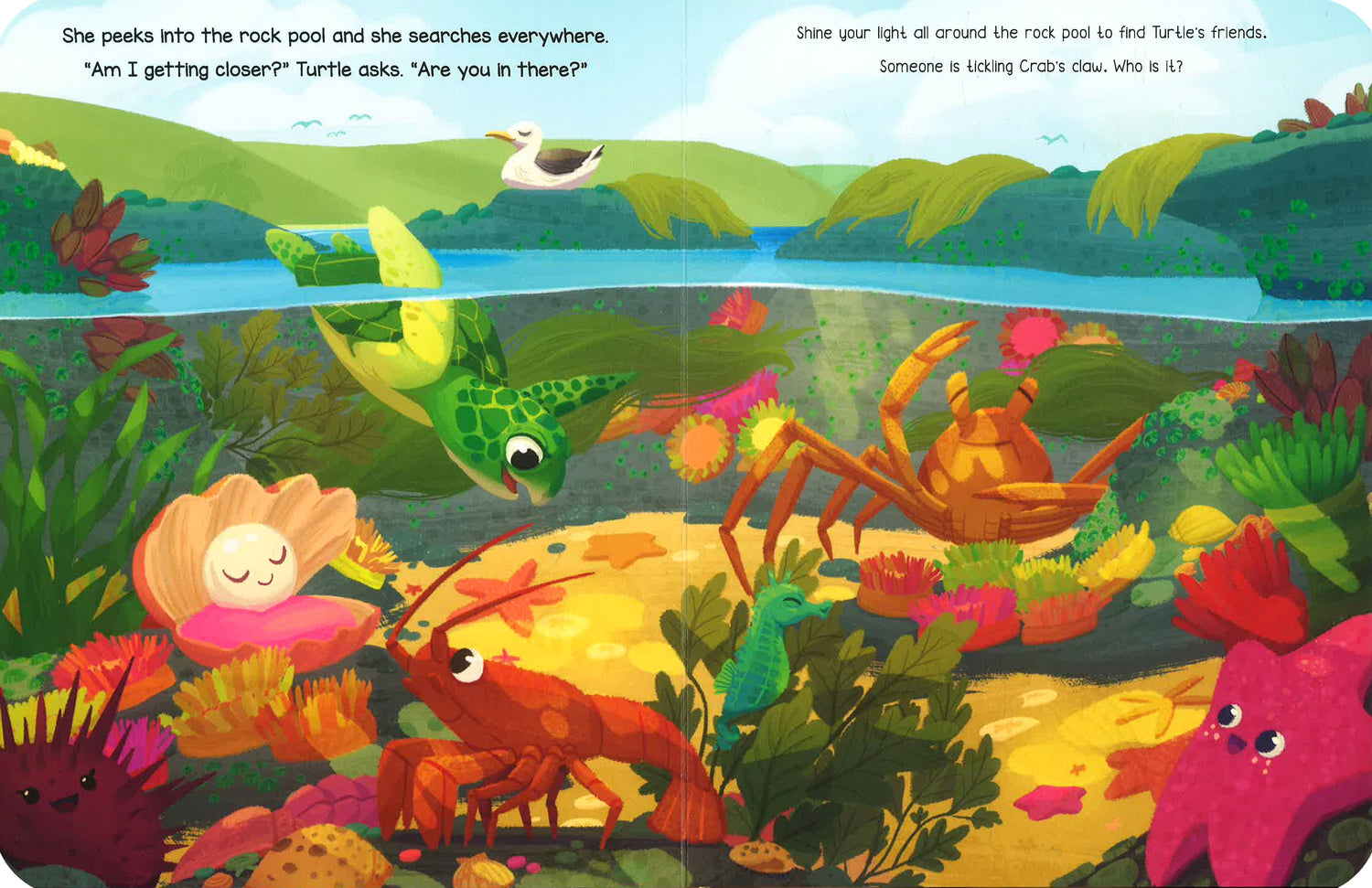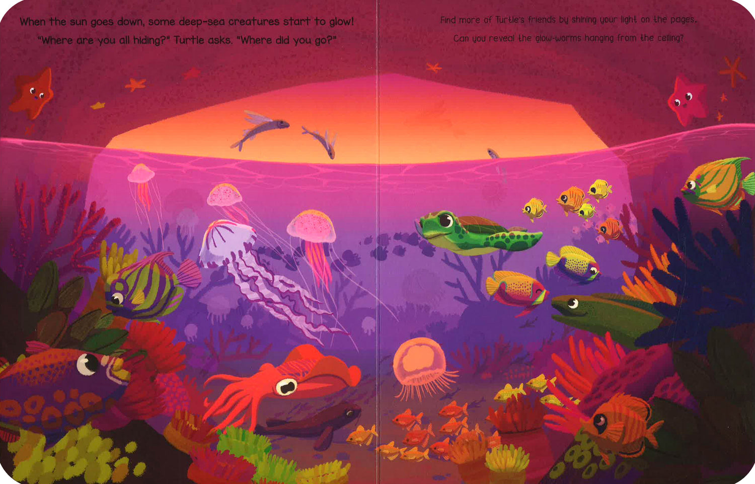 Help Turtle find her friends in this incredible magical light book! Shine the detachable torch across the pages to uncover the ocean's colourful secret characters and join Turtle on a magical, interactive adventure!