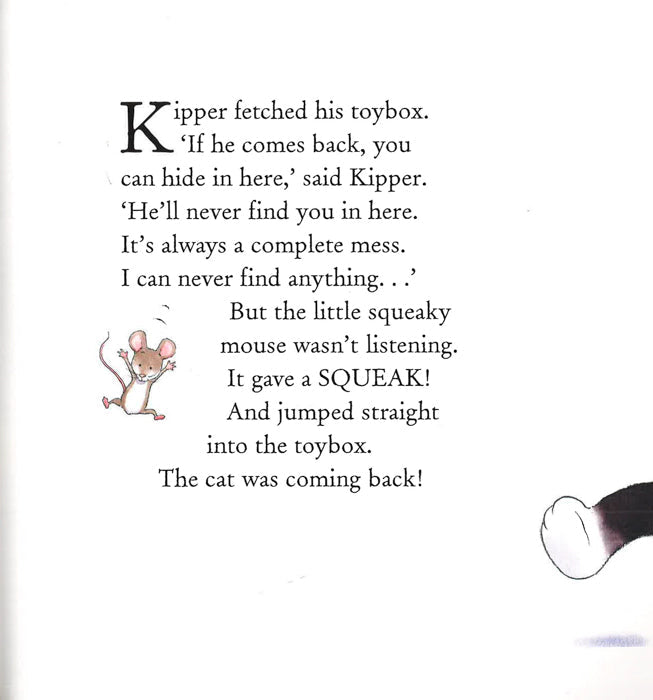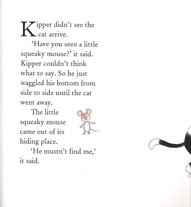 As Kipper is quietly reading his book, a little squeaky mouse suddenly runs across the pages and hides in the foldy bit. ‘Are you in this story?’ says Kipper. ‘Shhhhh!’, says the mouse. ‘I’m hiding!’ While a cat chases the mouse through the pages of this book, kind-hearted Kipper helps it to hide. But is the cat going to gobble the mouse up? Or is something completely different going on? With an exciting chase, heaps of cute peekaboo moments and three cuddly characters to fall in love with, this Kipper tale is absolutely adorable.
