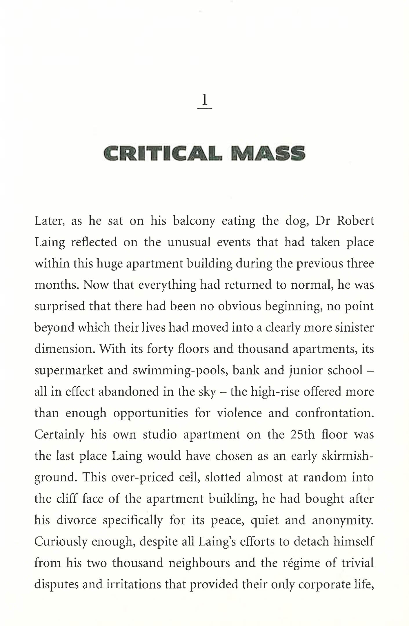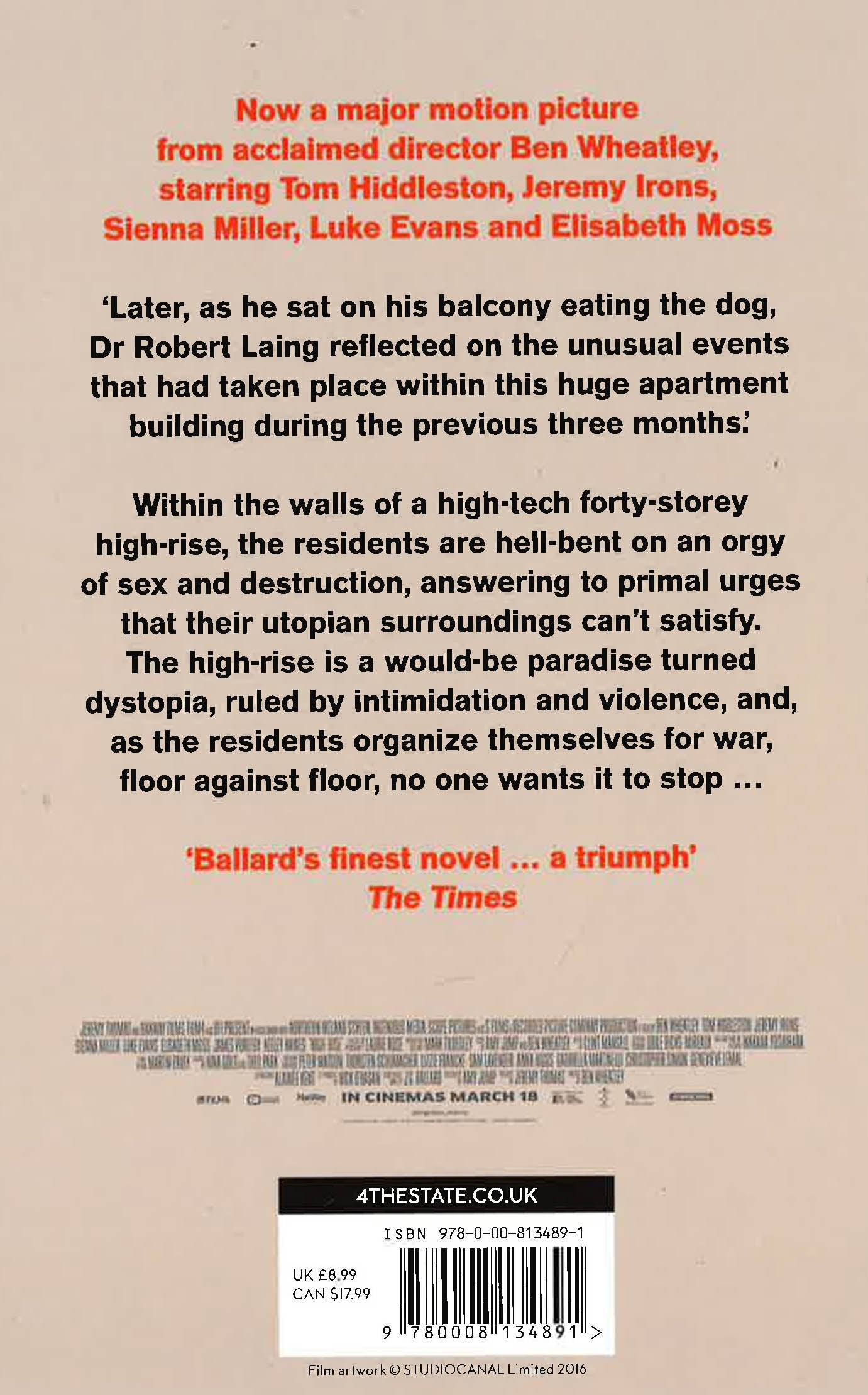 Within the concealing walls of an elegant forty-storey tower block, the affluent tenants are hell-bent on an orgy of destruction. Cocktail parties degenerate into marauding attacks on 'enemy' floors and the once-luxurious amenities become an arena for riots and technological mayhem. In this visionary tale of urban disillusionment society slips into a violent reverse as the isolated inhabitants of the high-rise, driven by primal urges, create a dystopian world ruled by the laws of the jungle.