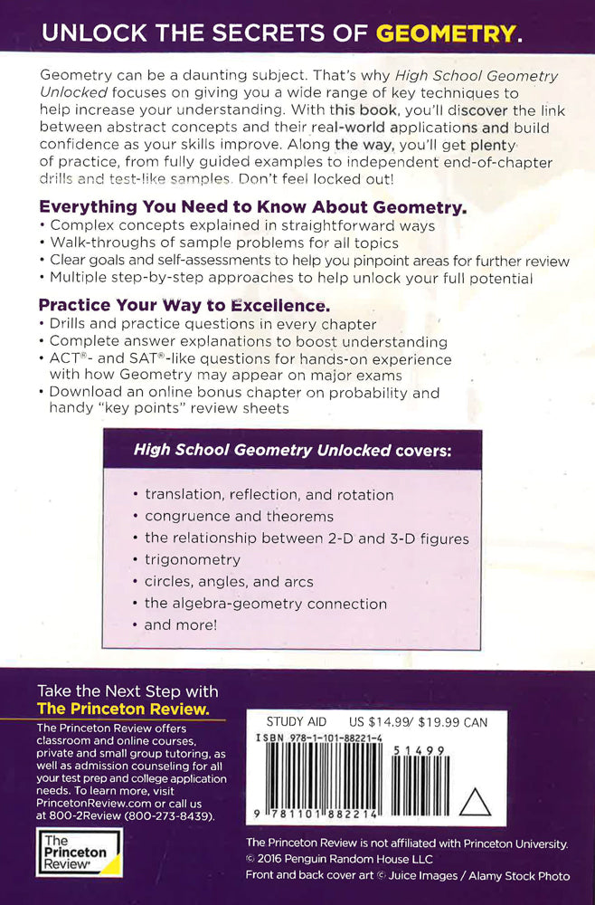 Geometry can be a daunting subject. That's why our new High School Unlocked series focuses on giving you a wide range of key techniques to help you tackle subjects like Geometry. If one method doesn't "click" for you, you can use an alternative approach to understand the concept or problem, instead of painfully trying the same thing over and over without success. Trust us--unlocking geometric secrets doesn't have to hurt! With this book, you'll discover the link between abstract concepts and their real-world applications and build confidence as your skills improve. Along the way, you'll get plenty of practice, from fully guided examples to independent end-of-chapter drills and test-like samples.