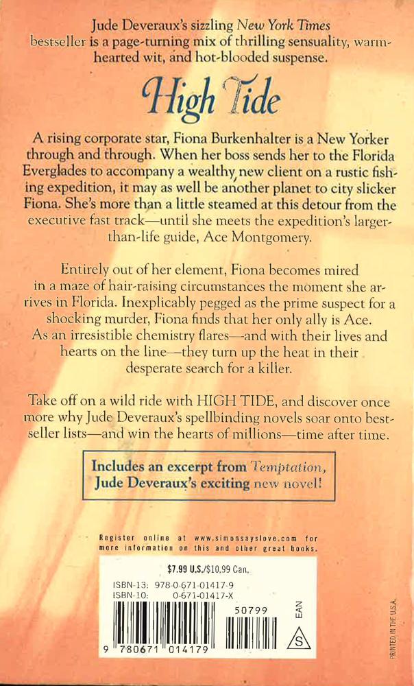 Jude Deveraux's sizzling New York Times bestseller is a page-turning mix of thrilling sensuality, warmhearted wit, and hot-blooded suspense. A rising corporate star, Fiona Burkenhalter is a New Yorker through and through. When her boss sends her to the Florida Everglades to accompany a wealthy new client on a rustic fishing expedition, it may as well be another planet to city slicker Fiona. She's more than a little steamed at this detour from the executive fast track -- until she meets the expedition's larger-than-life guide, Ace Montgomery. Entirely out of her element, Fiona becomes mired in a maze of hair-raising circumstances the moment she arrives in Florida. Inexplicably pegged as the prime suspect for a shocking murder, Fiona finds that her only ally is Ace. As an irresistible chemistry flares -- and with their lives and hearts on the line -- they turn up the heat in their desperate search for a killer. Take off on a wild ride with High Tide, and discover once more why Jude Deveraux's spellbinding novels soar onto bestseller lists -- and win the hearts of millions -- time after time.
