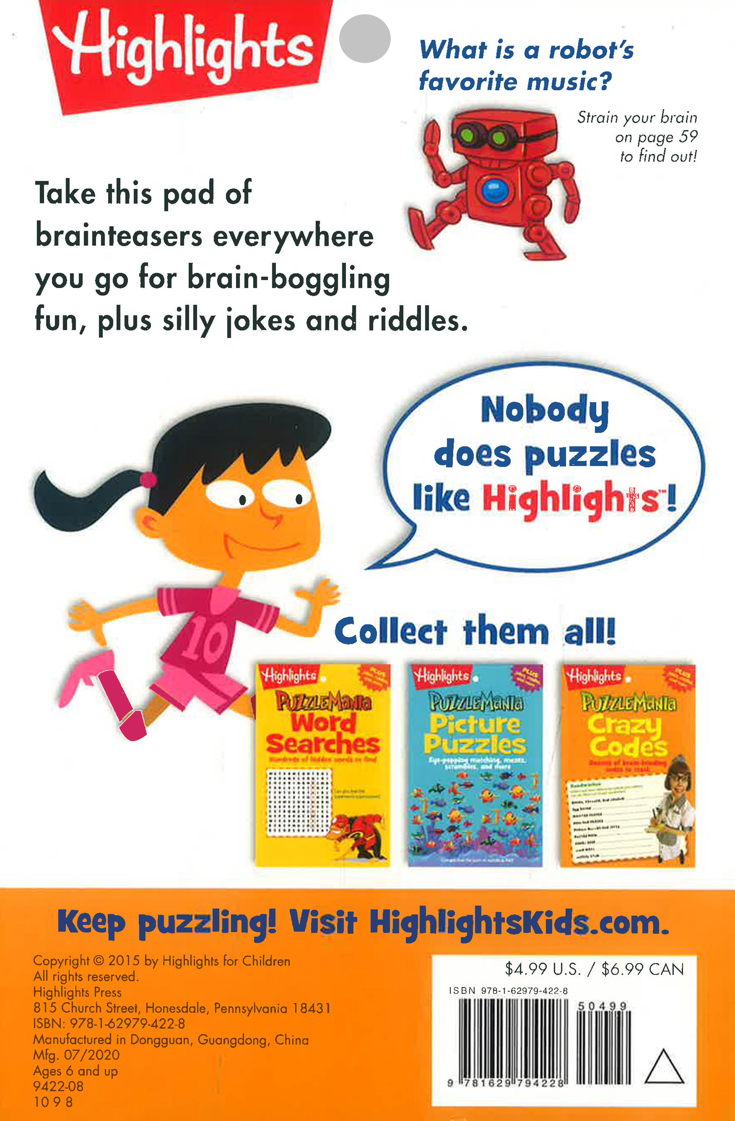 From the editors of Highlights’ ever-popular Puzzlemania and Puzzle Buzz series, this curated collection of brain-boggling fun will keep challenge seekers and logic-puzzle lovers entertained for hours. Formatted in an on-the-go, fun-to-share activity pad format, it contains more than 30 trivia, logic, and super-challenge puzzles, plus lots of bonus jokes,cartoons, quizzes (and more) that make it an experience that is uniquely Highlights. The four-color puzzles are on one side of the page, with the bonus content on the other side, making it an engaging back-to-back experience.