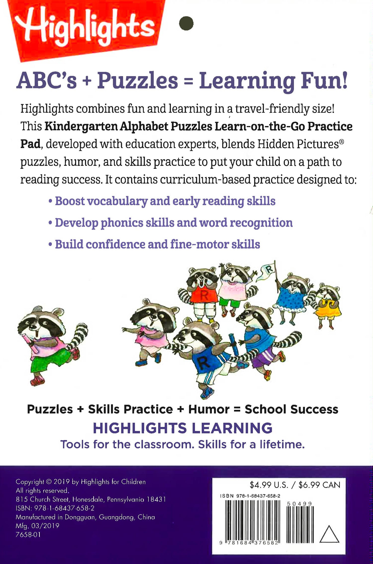 Letter identification and alphabet practice through Hidden Pictures® puzzles, matching, and more, all featured in an affordable, travel-friendly pad format.It's no secret: kids tend to learn best when they are having fun. Alphabet Puzzles is a 64-page full-color pad packed with fun activities for kids preschool-age and up to build their confidence as they learn letters and build alphabet skills, which are important steps toward reading readiness.