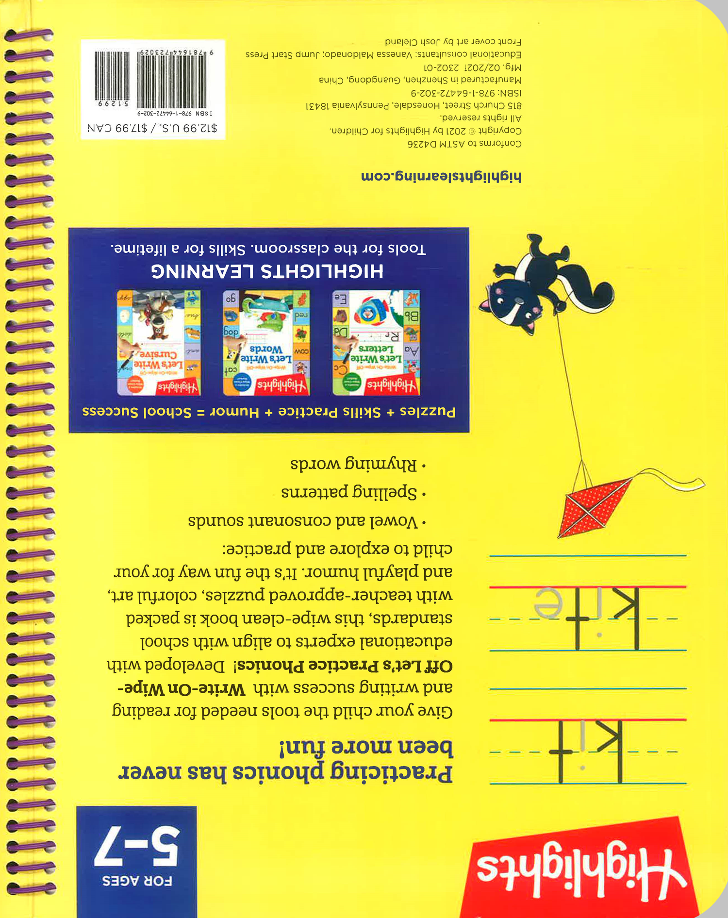 Phonics skills are important building blocks for reading success. Highlights brings "Fun with a Purpose" to this essential learning activity with this 56-page, full-color, write-on wipe-off book that includs a dry erase marker. This book, created with education experts, covers consonant blends, rhyming words, vowel sounds, spelling patterns, and more--all designed to help kids improve reading and writing skills and build confidence in the classroom. Hidden Pictures puzzles, mazes, and other activities help reinforce learning and add to the fun.