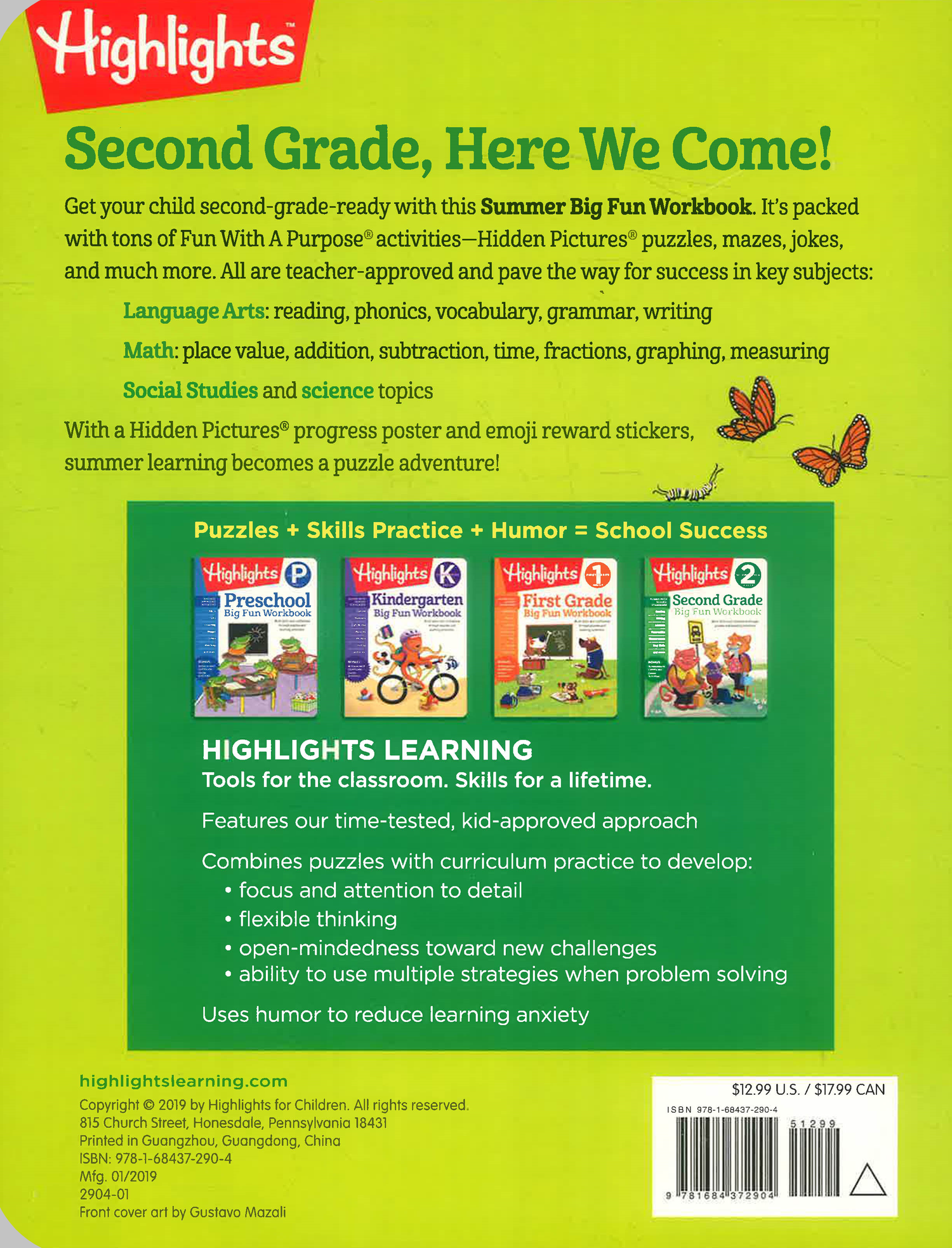 Over 450,000 series copies sold! Get your kids ready for the first day of second grade and keep learning skills sharp with this activity-rich, curriculum-based workbook. Organized week-by-week and aligned with state standards, our book includes puzzles that make skills practice fun, plus a bonus pull-out Hidden Pictures progress poster, fun reward stickers, an award certificate and extra activities that kids can take outdoors. Winner, Family Choice Award Winner, PAL (Play Advances Language) Award National Parenting Seal of Approval Winner, Teachers' Choice Award PAL (Play Advances Language) Top Ten Pick Expertly crafted to combat "summer slide," our 2nd grade workbook will give kids a head start on their upcoming school year. This summer learning book provides the right balance of review to keep skills sharp and a preview of what's to come, and features a wealth of Fun with a Purpose puzzle-based activities. Also, find ideas for simple ways to extend the learning through fun outdoor activities. This workbook covers vowels and consonants, syllables, parts of speech, cursive writing, reading, punctuation, shapes, addition and subtraction, fractions, time, measuring, regrouping, map skills and science.