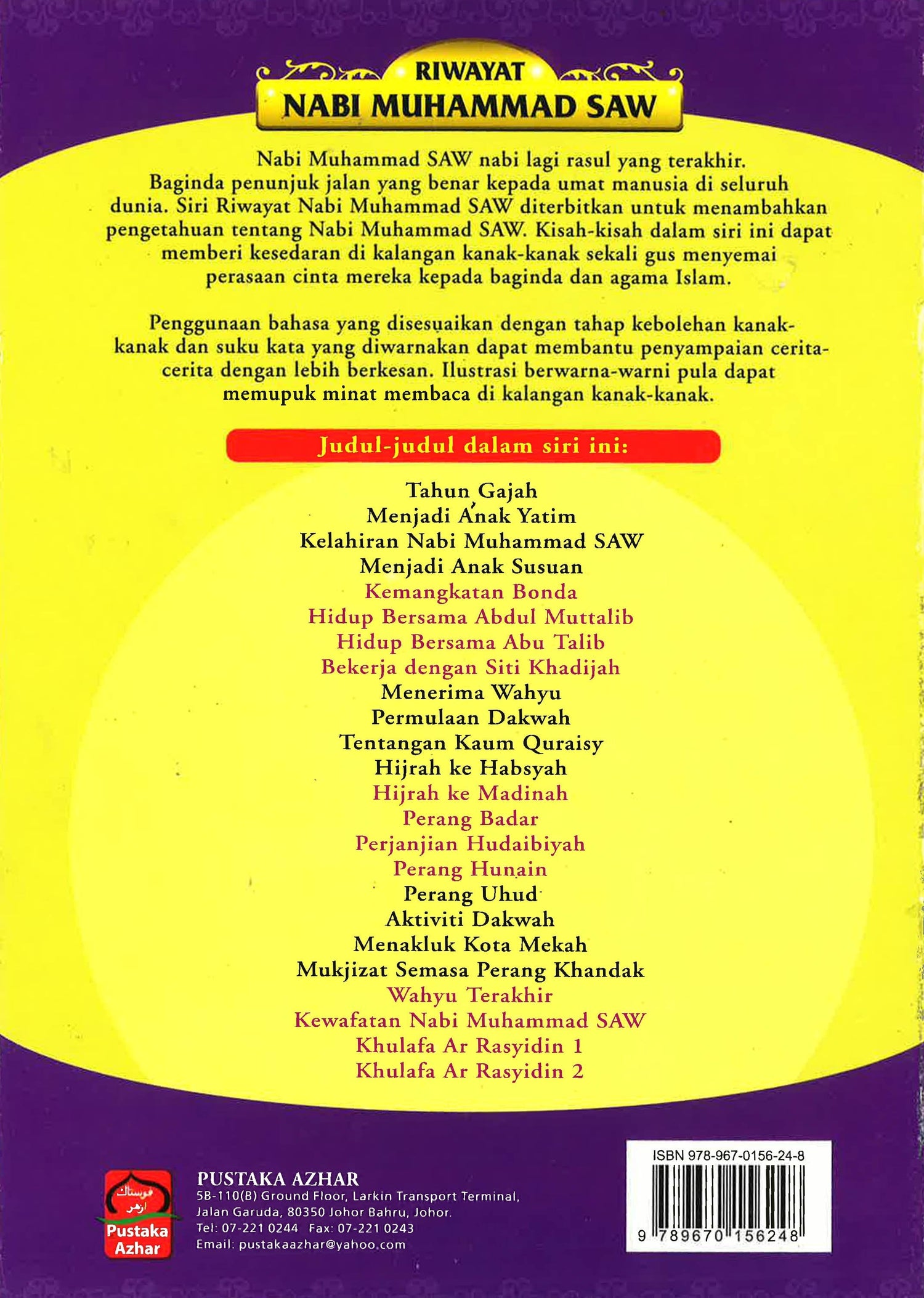 Nabi Muhammad SAW nabi lagi rasul yang terakhir. Baginda penunjuk jalan yang benar kepada umat manusia di seluruh dunia. Siri Riwayat Nabi Muhammad SAW diterbitkan untuk menambahkan pengetahuan tentang Nabi Muhammad SAW. Kisah-kisah dalam siri ini dapat memberi kesedaran di kalangan kanak-kanak sekali gus menyemai perasaan cinta mereka kepada baginda dan agama Islam. Penggunaan bahasa yang disesuaikan dengan tahap kebolehan kanak kanak dan suku kata yang diwarnakan dapat membantu penyampaian cerita cerita dengan lebih berkesan. Ilustrasi berwarna-warni pula dapat memupuk minat membaca di kalangan kanak-kanak.