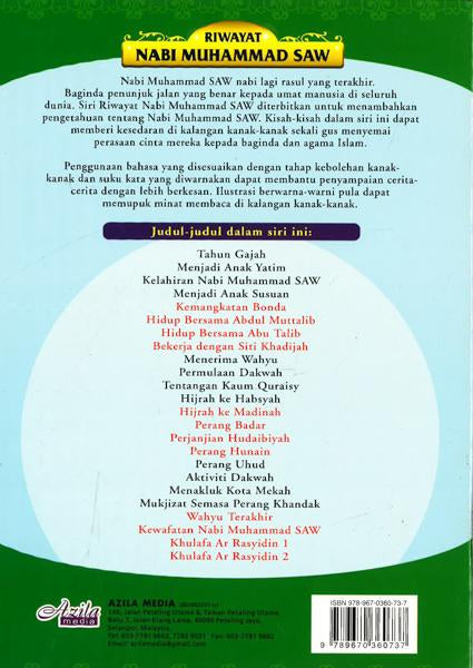 Nabi Muhammad SAW nabi lagi rasul yang terakhir. Baginda penunjuk jalan yang benar kepada umat manusia di seluruh dunia. Siri Riwayat Nabi Muhammad SAW diterbitkan untuk menambahkan pengetahuan tentang Nabi Muhammad SAW. Kisah-kisah dalam siri ini dapat memberi kesedaran di kalangan kanak-kanak sekali gus menyemai perasaan cinta mereka kepada baginda dan agama Islam.