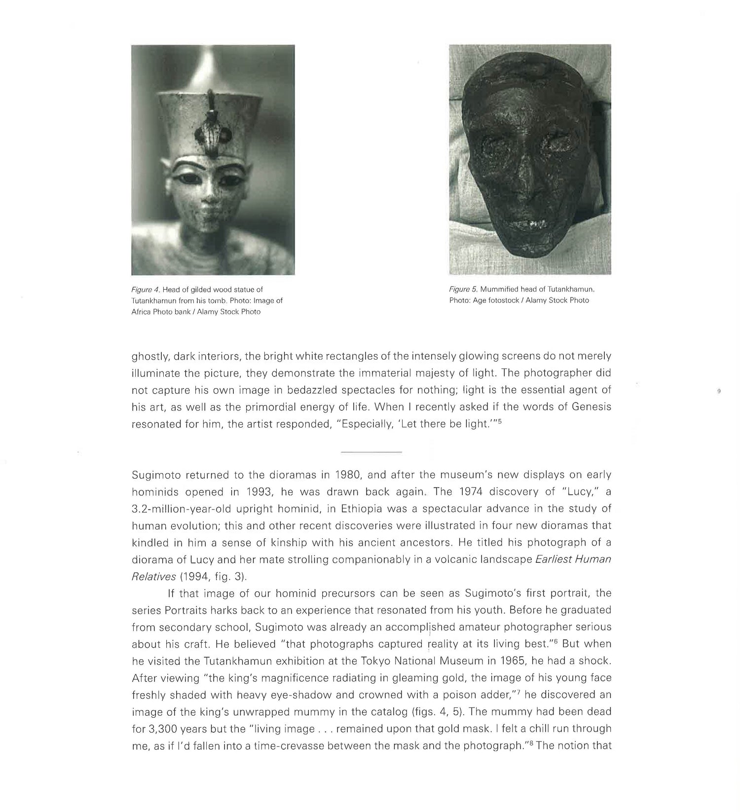 At first glance, Hiroshi Sugimoto’s photographic portrait of King Henry VIII of England is arresting: his camera has captured the tactility of Henry’s luxurious furs and silks, the elaborate embroidery of his doublet, and the light reflecting off of each shimmering jewel. The contours of the king’s face are so lifelike that he appears to be almost three- dimensional. It seems as though the twenty-first century artist has traveled back in time nearly five hundred years to photograph his royal subject. While Sugimoto’s portraits of historical figures appear to capture a lived moment in time, they are fictions. These portraits are in fact at least twice removed from the subject: his photograph captures a wax figure that has been created by a sculptor from either a photographic portrait or a painted one. Sugimoto has photographed his portraits of historical subjects in black and white, with each “sitter” posed against a black background, giving the images an austere formality. The black backdrop, free of any props or additional visual information, amplifies the illusion that we are viewing a contemporary portrait in which the subject has stepped out of history. Other portraits appear to be photojournalistic. Sugimoto’s image of the Duke of Wellington at Napoleon’s deathbed is actually a photograph of the mise en scene created by the wax museum, but it registers as real in our minds. The portraits of wax figures, which in this volume are presented alongside a handful of portraits of living subjects and photographs of memento mori, call into question what it is the portrait captures. As with his other major bodies of work―Dioramas, Seascapes, Theaters―Sugimoto’s Portraits address the passage of time and history. We recognize these historical figures because of the many contemporaneous drawings, paintings, sculptures, and photographs that have recorded them. We take it for granted that a photograph of a living subject is true, but what does that mean? Are Sugimoto’s portraits of living subjects more “true” than the historical portraits of wax figures? Is Hans Holbein’s painted portrait of Henry VIII truer than Sugimoto’s photograph of the wax figure made from Holbein’s painting?