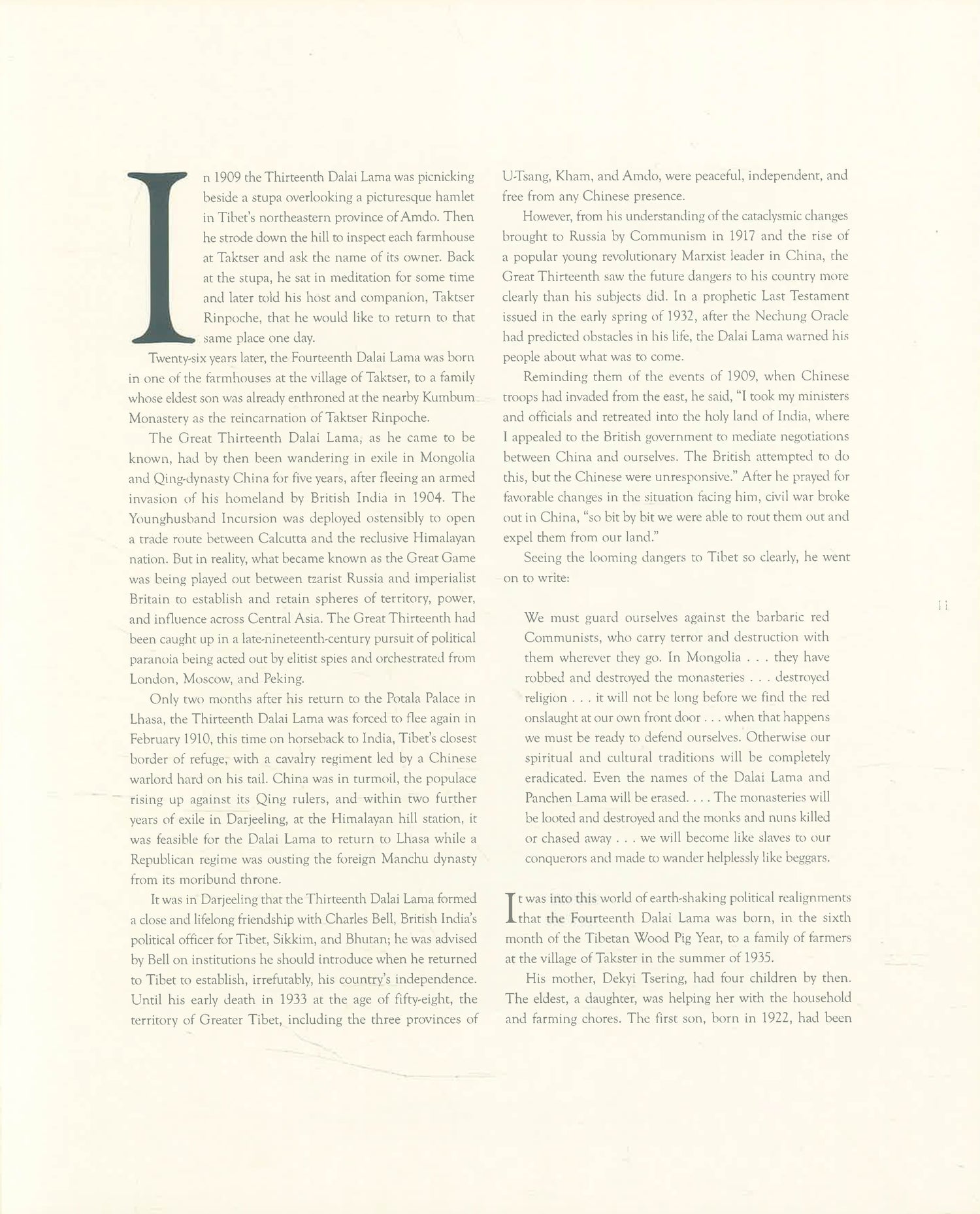 Born to a peasant family in 1935, Lhamo Thondup was recognized at age two as the reincarnation of the Dalai Lama and became the temporal leader of Tibet at age fifteen. In 1959, he was forced into exile in India after the Chinese military occupation of Tibet. Since 1960, he has resided in Dharamsala, aptly known as "Little Lhasa," the seat of the Tibetan government-in-exile.