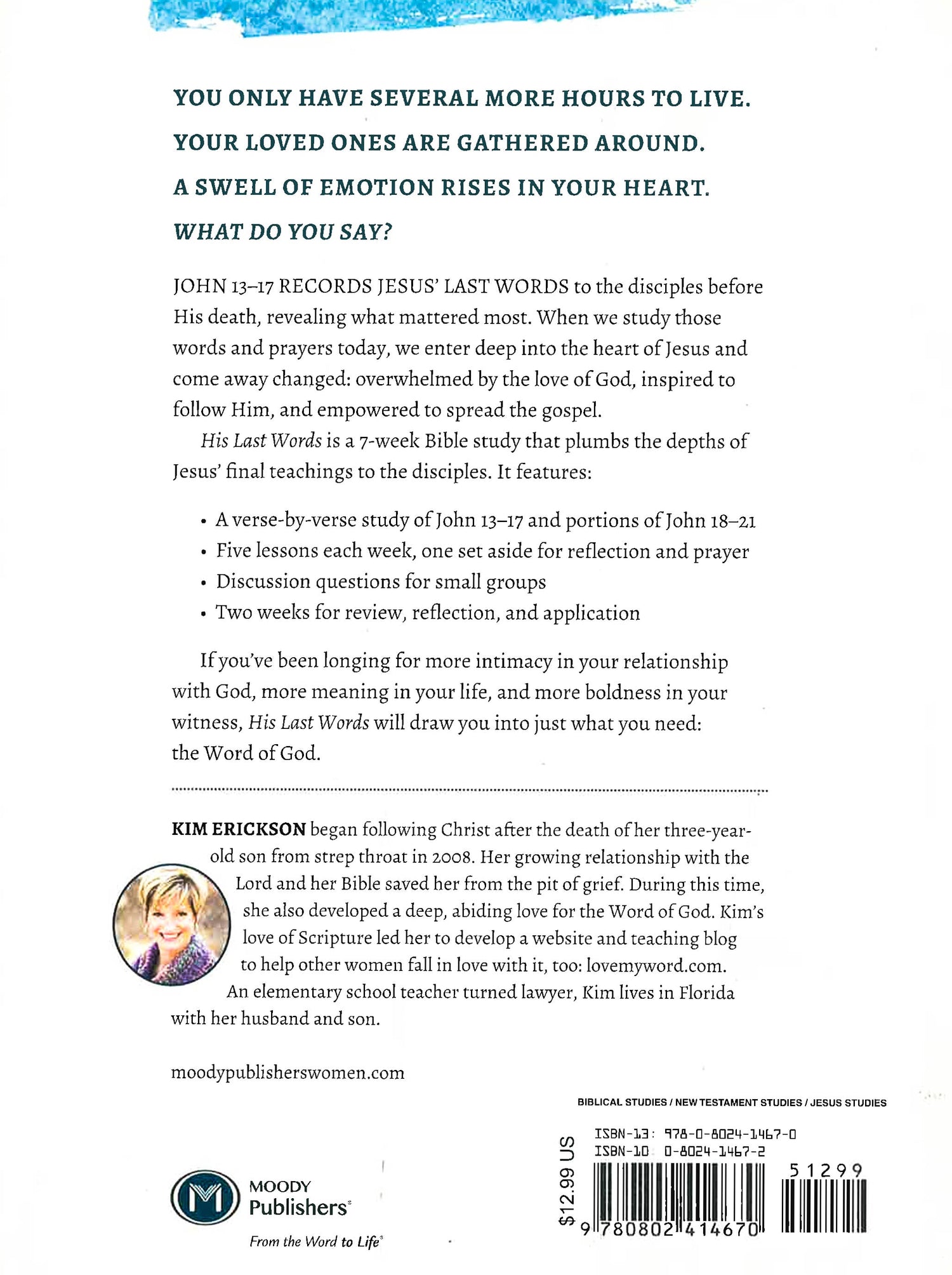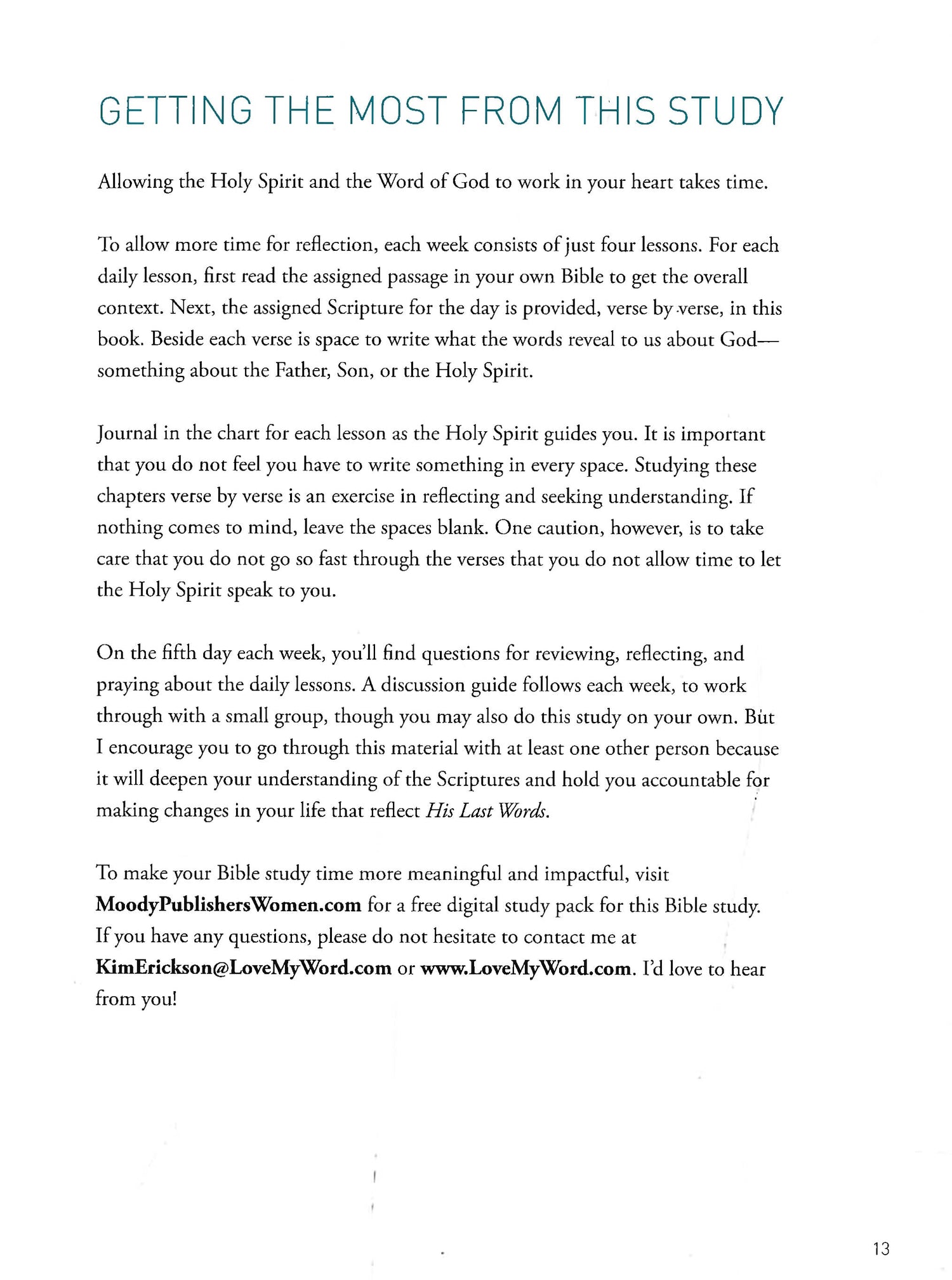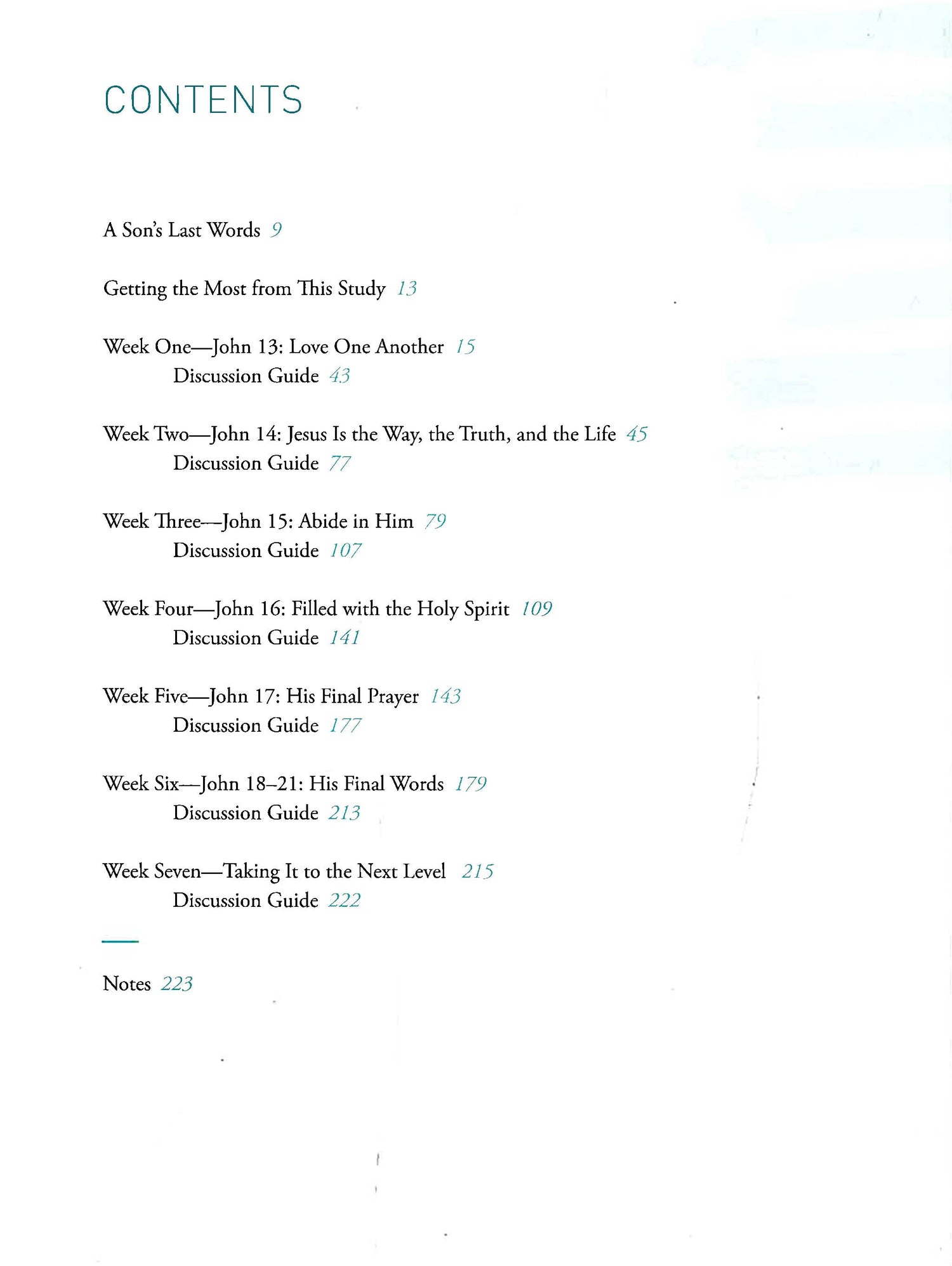 His Last Words is an 7-week Bible study that plumbs the depths of Jesus' final teachings to the disciples. It features: A verse-by-verse study of John 13-17 and portions of John 18-21Five lessons each week, one set aside for reflection and prayerDiscussion questions for small groupsTwo weeks for review, reflection, and application