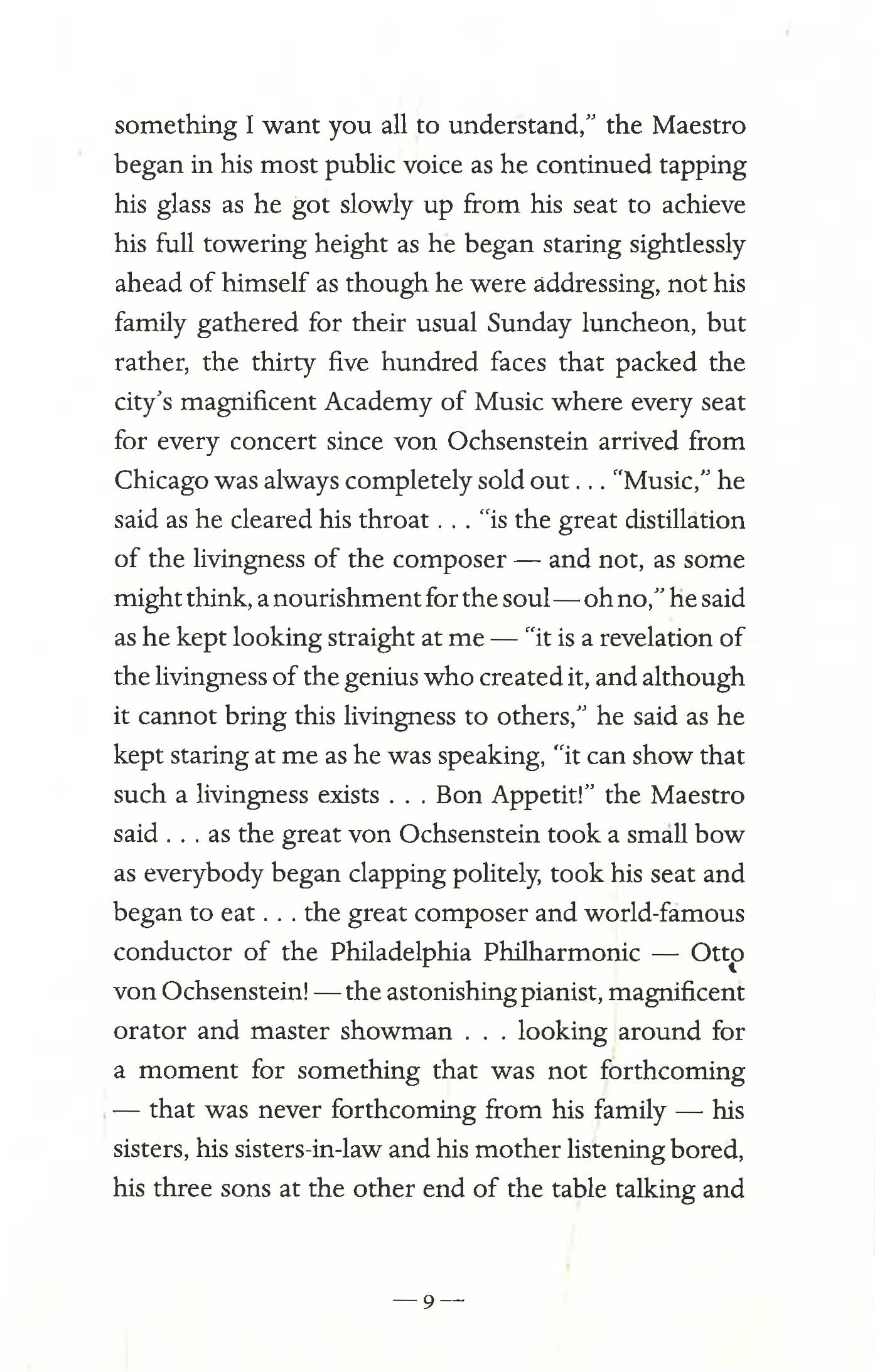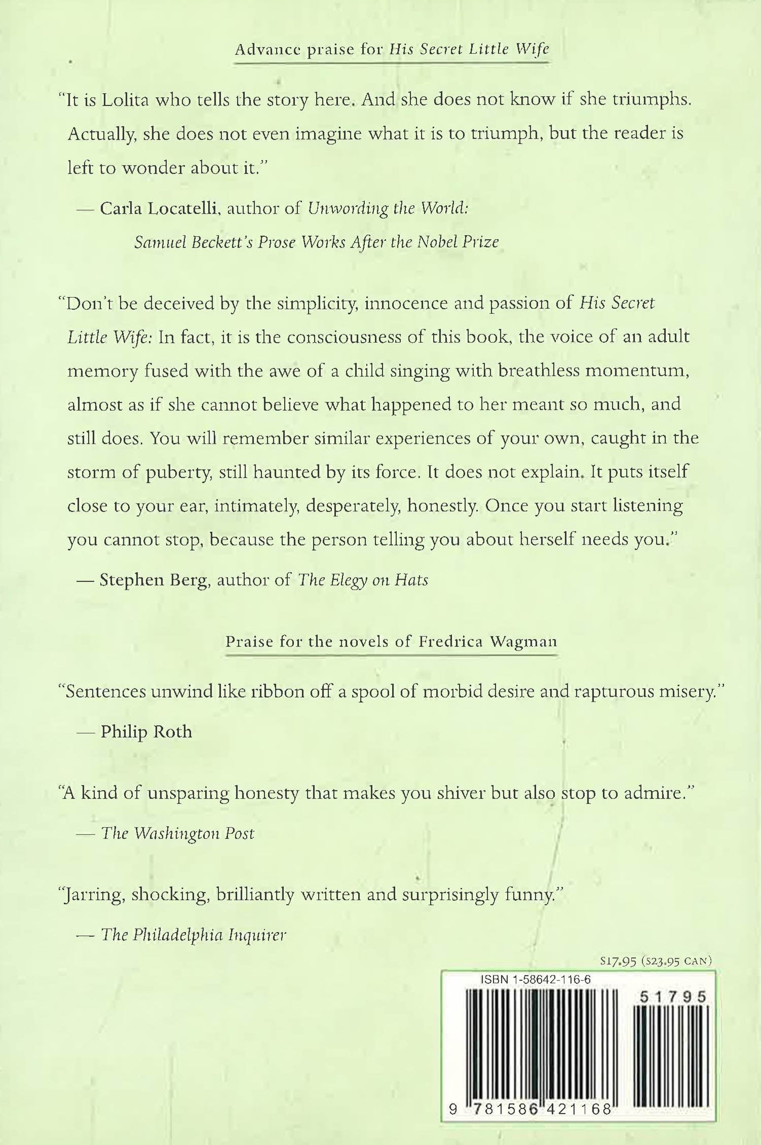 It is a story of seduction, of hope, of obsession and triumph. It is also the story of a supremely narcissistic man of genius and insatiable appetites whose magnetic appeal is irresistible, even to those he would use, discard, and even destroy; a bold man with a horrendous sense of entitlement who takes what he wants to take, dumps whom he wants to dump, and never looks back; a man incapable of sorrow, of grieving; a man who destroys everything in his wake. Told through the eyes of a child - as if Lolita had narrated her tale rather than Humbert Humbert - the narrator doesn't understand the darker side of her relationship with The Maestro as she blossoms within a world that lacks all boundaries. Employing a beautiful and unique style, Fredrica Wagman makes the reader privvy to the thoughts and emotions of a young girl caught in the throes of a relationship beyond her own comprehension.