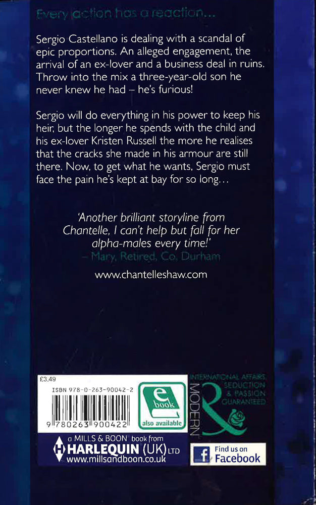 Every action has a reaction...Sergio Castellano is dealing with a scandal of epic proportions. An alleged engagement, the arrival of an ex-lover and a business deal in ruins. Throw into the mix a three-year-old son he never knew he had - he's furious! Sergio will do everything in his power to keep his heir, but the longer he spends with the child and his ex-lover Kristen Russell the more he realises that the cracks she made in his armour are still there. Now, to get what he wants, Sergio must face the pain he's kept at bay for so long..."Another brilliant storyline from Chantelle, I can't help but fall for her alpha-males every time!' - Mary, Retired, Co. Durham www.chantelleshaw.com
