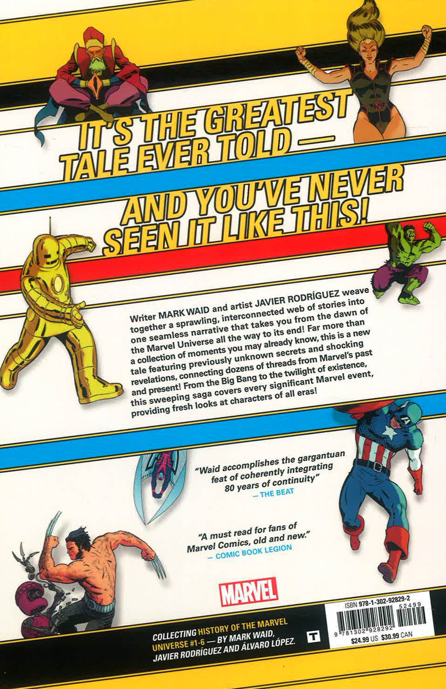 It's the greatest tale ever told - and you've never seen it like this! Writer Mark Waid and artist Javier Rodríguez weave together a sprawling, interconnected web of stories into one seamless narrative that takes you from the dawn of the Marvel Universe all the way to its end! Far more than a collection of moments you may already know, this is a new tale featuring previously unknown secrets and shocking revelations, connecting dozens of threads from Marvel's past and present! From the Big Bang to the twilight of existence, this sweeping saga covers every significant Marvel event, providing fresh looks at characters of all eras! Collecting HISTORY OF THE MARVEL UNIVERSE (2019) #1-6.